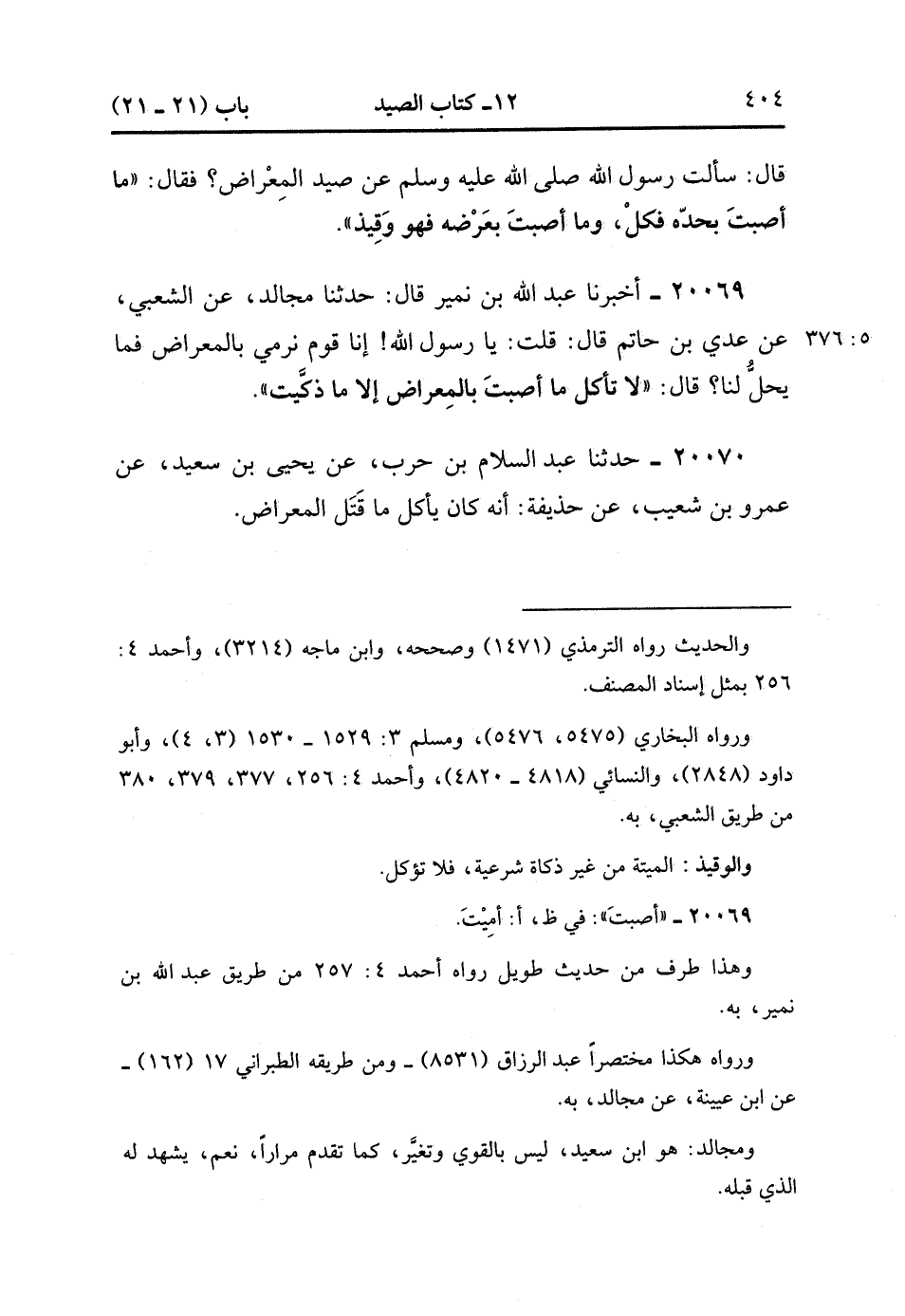 20069- حَدَّثَنَا أَبُو بَكْرٍ , قَالَ : أَخْبَرَنَا عَبْدُ اللهِ بْنُ نُمَيْرٍ , قَالَ : حدَّثَنَا مُجَالِدٌ ، عَنِ الشَّعْبِيِّ ، عَنْ عَدِيِّ بْنِ حَاتِمٍ ، قَالَ : قُلْتُ : يَا رَسُولَ اللهِ ، إنَّا قَوْمٌ نَرْمِي بِالْمِعْرَاضِ فَمَا يَحِلُّ لَنَا ؟ قَالَ : لاَ تَأْكُلْ مَا أَصَبْت بِالْمِعْرَاضِ إِلاَّ مَا ذَكَّيْت. (5/375).