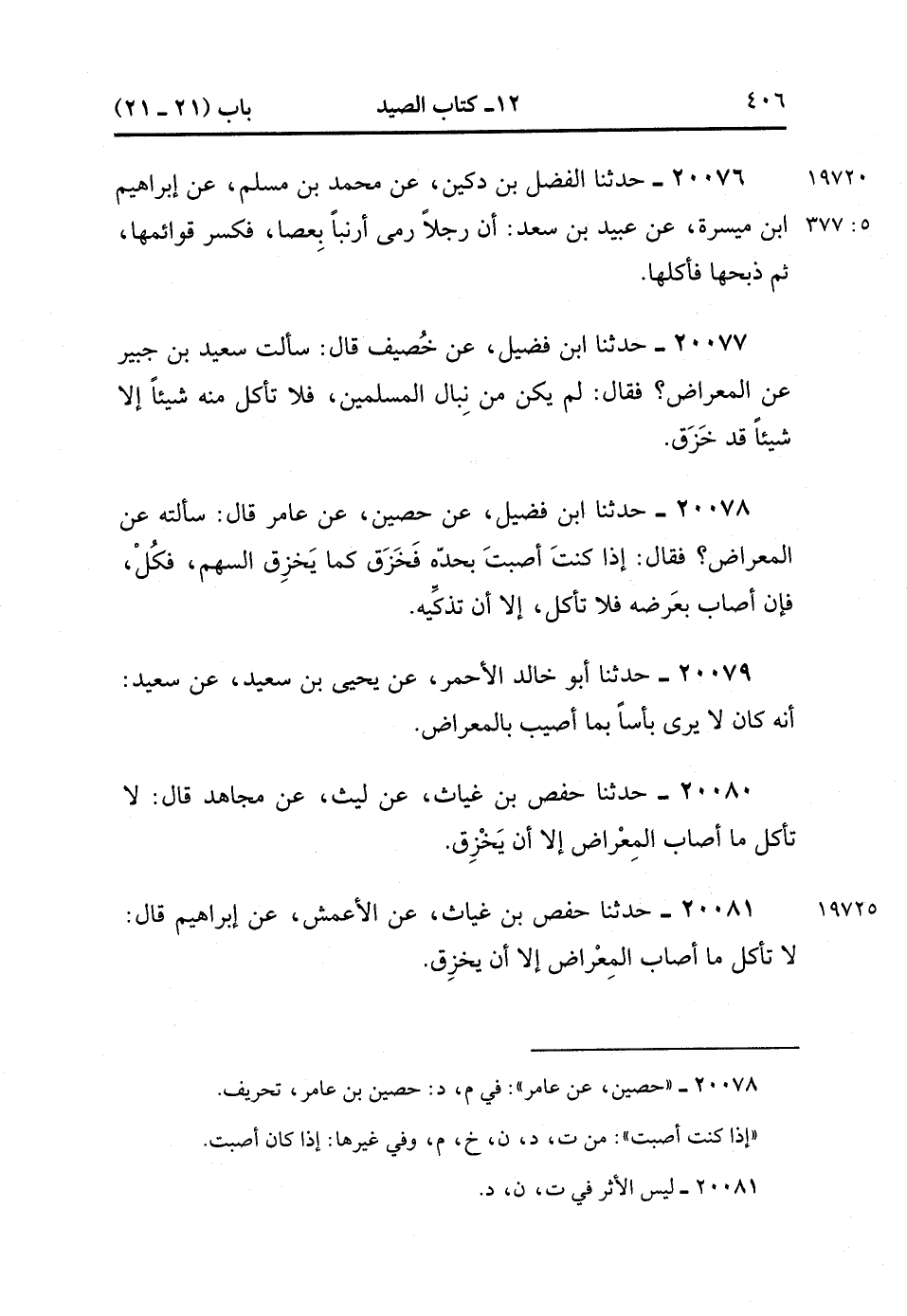 20081- حَدَّثَنَا حَفْصُ بْنُ غِيَاثٍ ، عَنِ الأَعْمَشِ ، عَنْ إبْرَاهِيمَ ، قَالَ : لاَ تَأْكُلْ مَا أَصَابَ الْمِعْرَاضُ إِلاَّ أَنْ يَخْزِقَ. (5/377).