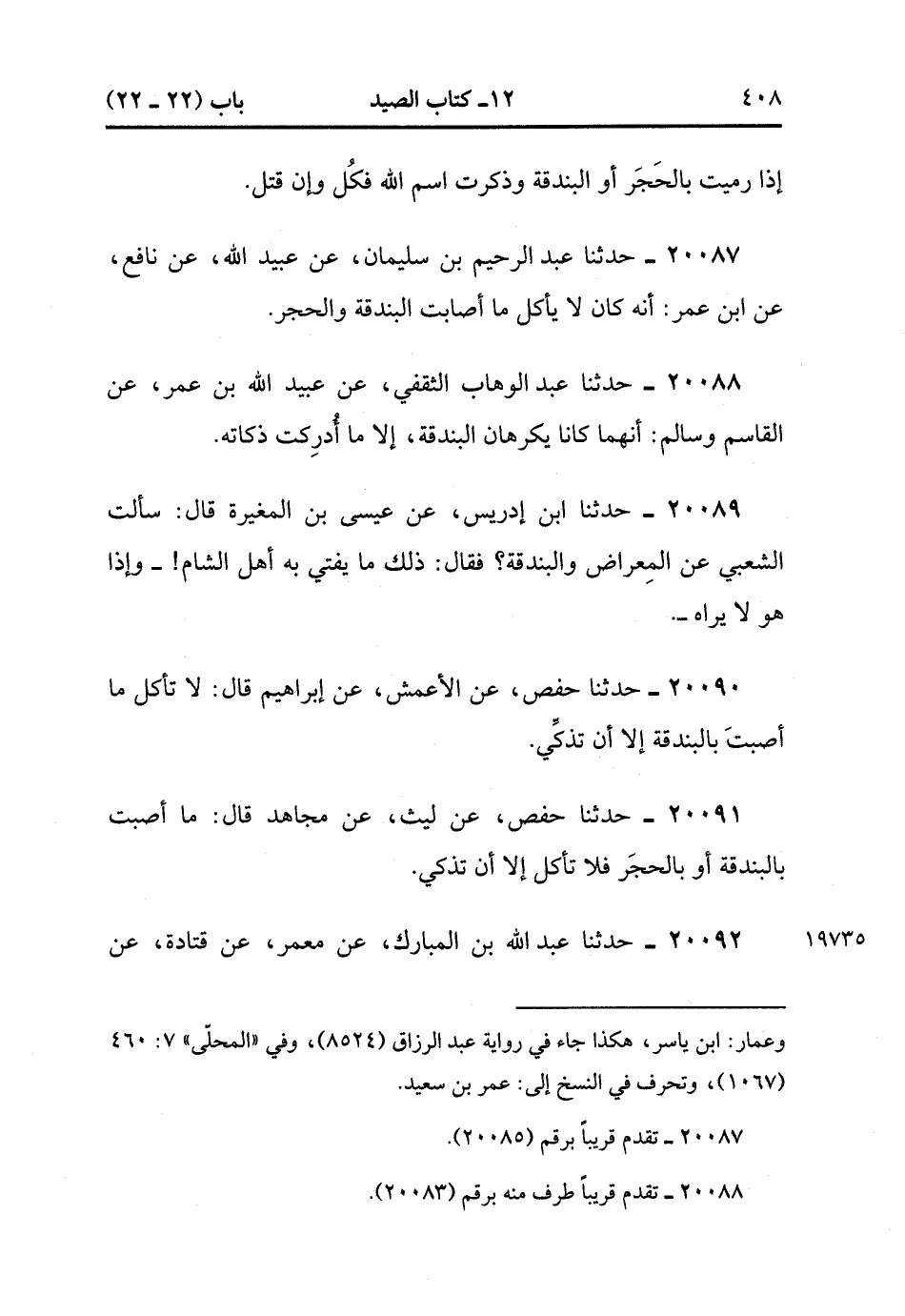 20088- حَدَّثَنَا عَبْدُ الْوَهَّابِ الثَّقَفِيُّ ، عَنْ عُبَيْدِ اللهِ بْنِ عُمَرَ ، عَنِ الْقَاسِمِ وَسَالِمٍ أَنَّهُمَا كَانَا يَكْرَهَانِ الْبُنْدُقَةَ إِلاَّ مَا أُدْرِكْت ذَكَاتَهُ.
