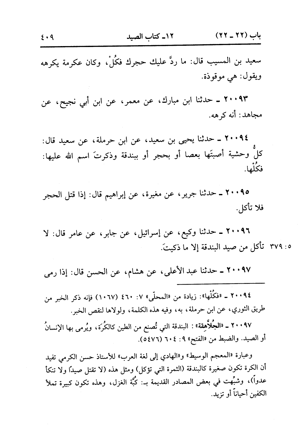 20096- حَدَّثَنَا وَكِيعٌ ، عَنْ إسْرَائِيلَ ، عَنْ جَابِرٍ ، عَنْ عَامِرٍ ، قَالَ : لاَ تَأْكُلْ مِنْ صَيْدِ الْبُنْدُقَةِ إِلاَّ مَا ذَكَّيْت. (5/378).