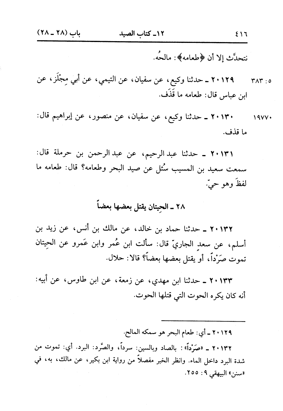 20131- حَدَّثَنَا عَبْدُ الرَّحِيمِ ، عَنْ عَبْدِ الرَّحْمَنِ بْنِ حَرْمَلَةَ ، قَالَ : سَمِعْتُ سَعِيدَ بْنَ الْمُسَيَّبِ سُئِلَ عَنْ صَيْدِ الْبَحْرِ وَطَعَامِهِ ، قَالَ : طَعَامُهُ مَا لَفَظَ وَهُوَ حَيٌّ.