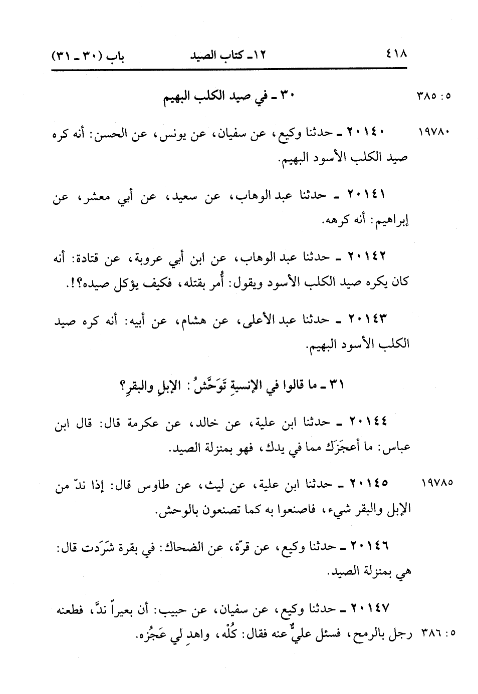 20143- حَدَّثَنَا عَبْدُ الأَعْلَى ، عَنْ هِشَامٍ ، عَنْ أَبِيهِ ، أَنَّهُ كَرِهَ صَيْدَ الْكَلْبِ الأَسْوَدِ الْبَهِيمِ.
