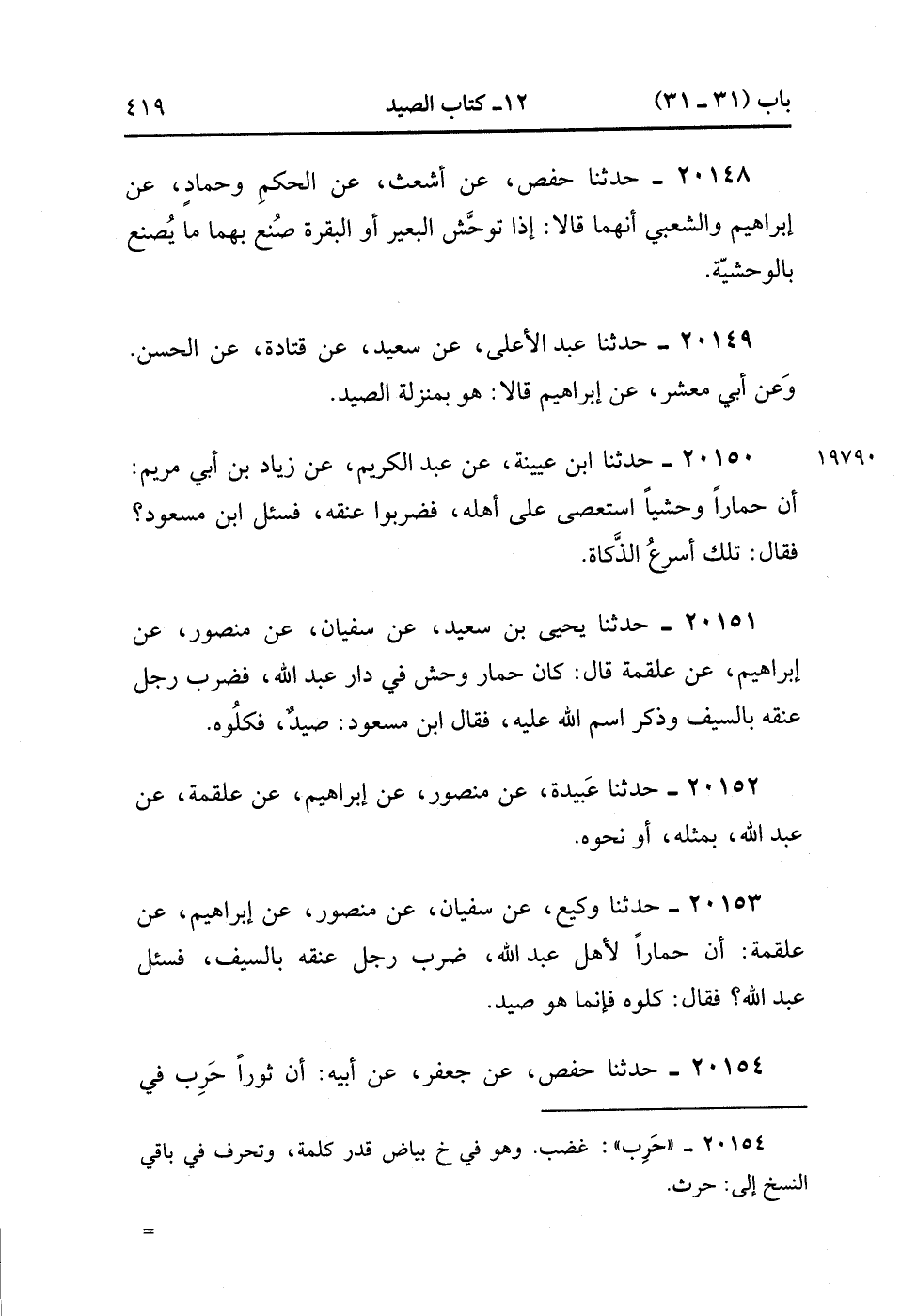 20153- حَدَّثَنَا وَكِيعٌ ، عَنْ سُفْيَانَ ، عَنْ مَنْصُورٍ ، عَنْ إِبْرَاهِيمَ ، عَنْ عَلْقَمَةَ ، أَنَّ حِمَارًا لأَهْلِ عَبْدِ اللهِ ضَرَبَ رَجُلٌ عُنُقَهُ بِالسَّيْفِ فَسُئِلَ عَبْدُ اللهِ ، فَقَالَ : كُلُوهُ ، إنَّمَا هُوَ صَيْدٌ. (5/386).