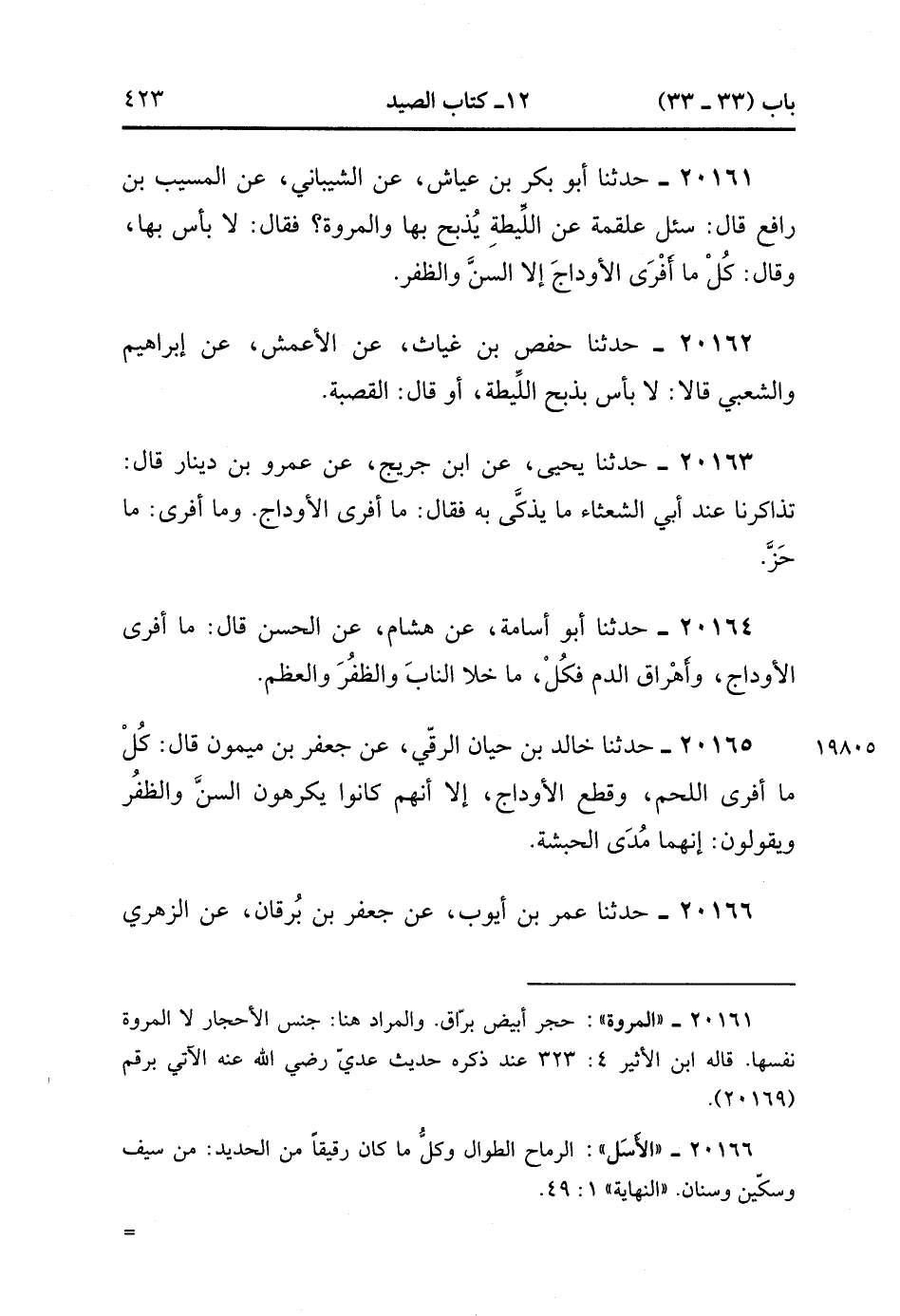 20161- حَدَّثَنَا أَبُو بَكْرٍ بْنُ عَيَّاشٍ ، عَنِ الشَّيْبَانِيِّ ، عَنِ الْمُسَيَّبِ بْنِ رَافِعٍ ، قَالَ : سُئِلَ عَلْقَمَةُ عَنِ اللِّيطَةِ يُذْبَحُ بِهَا وَالْمَرْوَةِ ، فَقَالَ : لاَ بأس بها وقال : كُلْ مَا أَفْرَى الأَوْدَاجَ إِلاَّ السِّنَّ وَالظُّفُرَ.