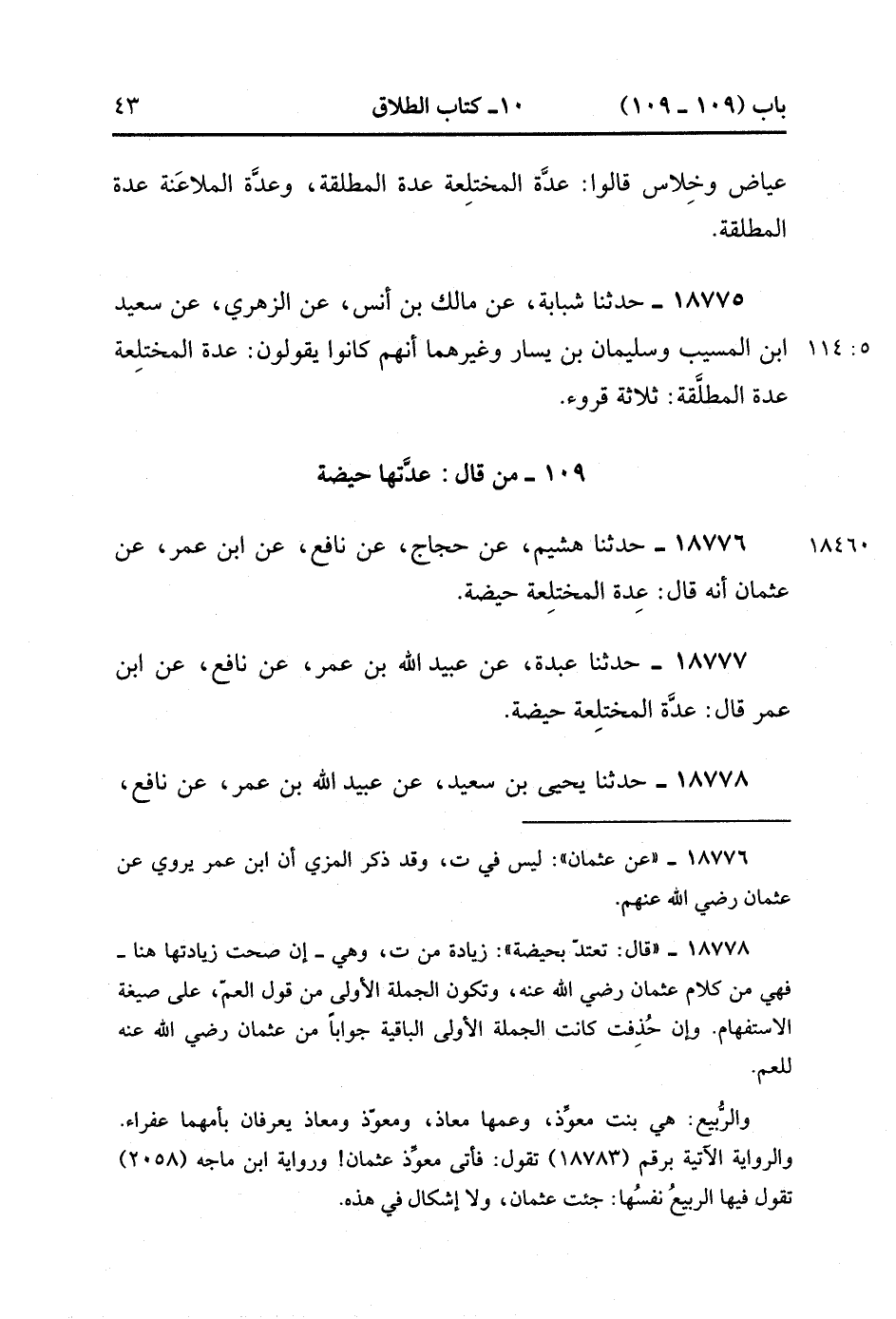 18775- حَدَّثَنَا شَبَابَةُ ، عَنْ مَالِكِ بْنِ أَنَسٍ ، عَنِ الزُّهْرِيِّ ، عَنْ سَعِيدِ بْنِ الْمُسَيَّبِ ، وَسُلَيْمَانَ بْنِ يَسَارٍ ، وَغَيْرَهُم ، أَنَّهُمْ كَانُوا يَقُولُونَ : عِدَّةُ الْمُخْتَلِعَةِ عِدَّةُ الْمُطَلَّقَةِ : ثَلاَثَةُ قُرُوءٍ. (5/113).