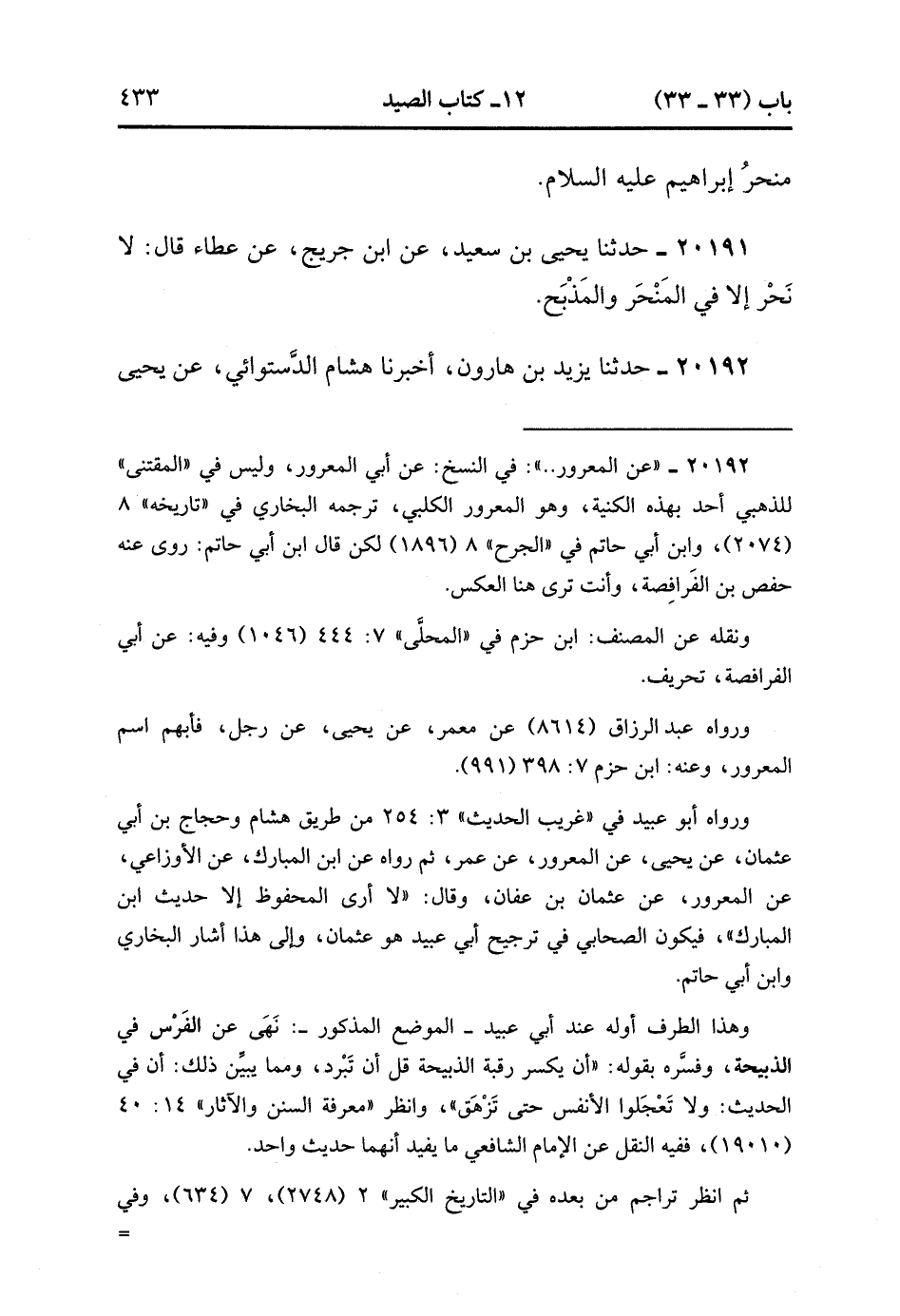 20192- حَدَّثَنَا يَزِيدُ بْنُ هَارُونَ أَخْبَرَنَا هِشَامٌ الدَّسْتُوَائِيُّ ، عَنْ يَحْيَى بْنِ أَبِي كَثِيرٍ ، عَنْ أَبِي الْمَعْرُورِ ، عَنِ ابْنِ الْفَرَافِصَةِ : أن الفَرَافِصَة كَانَ عِنْدَ عُمَرَ فَأَمَرَ مُنَادِيَهُ ، إنَّ النَّحْرَ فِي اللَّبَّةِ , وَالْحَلْقِ لِمَنْ قدر وَأَقِرُّوا الأَنْفُسَ حَتَّى تَزْهَقَ. (5/392).