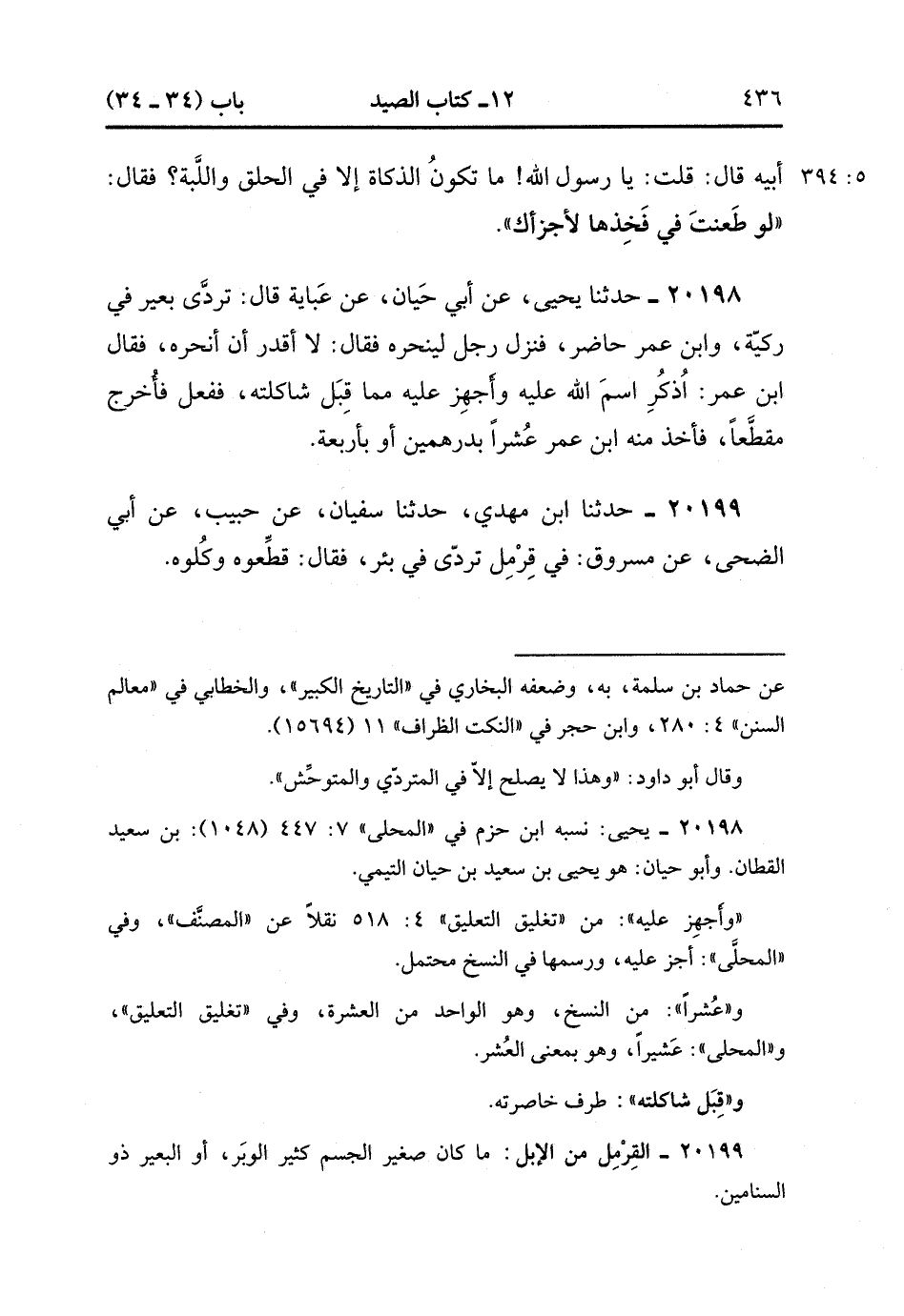 20198- حَدَّثَنَا يَحْيَى , عَنْ أَبِي حَيَّانَ ، عَنْ عَبَايَةَ ، قَالَ : تَرَدَّى بَعِيرٌ فِي رَكِيَّةٍ ، وَابْنُ عُمَرَ حَاضِرٌ فَنَزَلَ رَجُلٌ لِيَنْحَرَهُ ، فَقَالَ : لاَ أَقْدِرُ أَنْ أَنْحَرَهُ ، فقال ابْنَ عُمَرَ ، اذْكُرَ اسْمَ اللهِ عَلَيْهِ وَأَجْهِزْ عَلَيْهِ مِنْ قِبَلِ شَاكِلَتِهِ فَفَعَلَ ، فَأُخْرِجَ مُقَطَّعًا فَأَخَذَ مِنْهُ ابْنُ عُمَرَ عُشْرًا بِدِرْهَمَيْنِ ، أَوْ بِأَرْبَعَةٍ.
