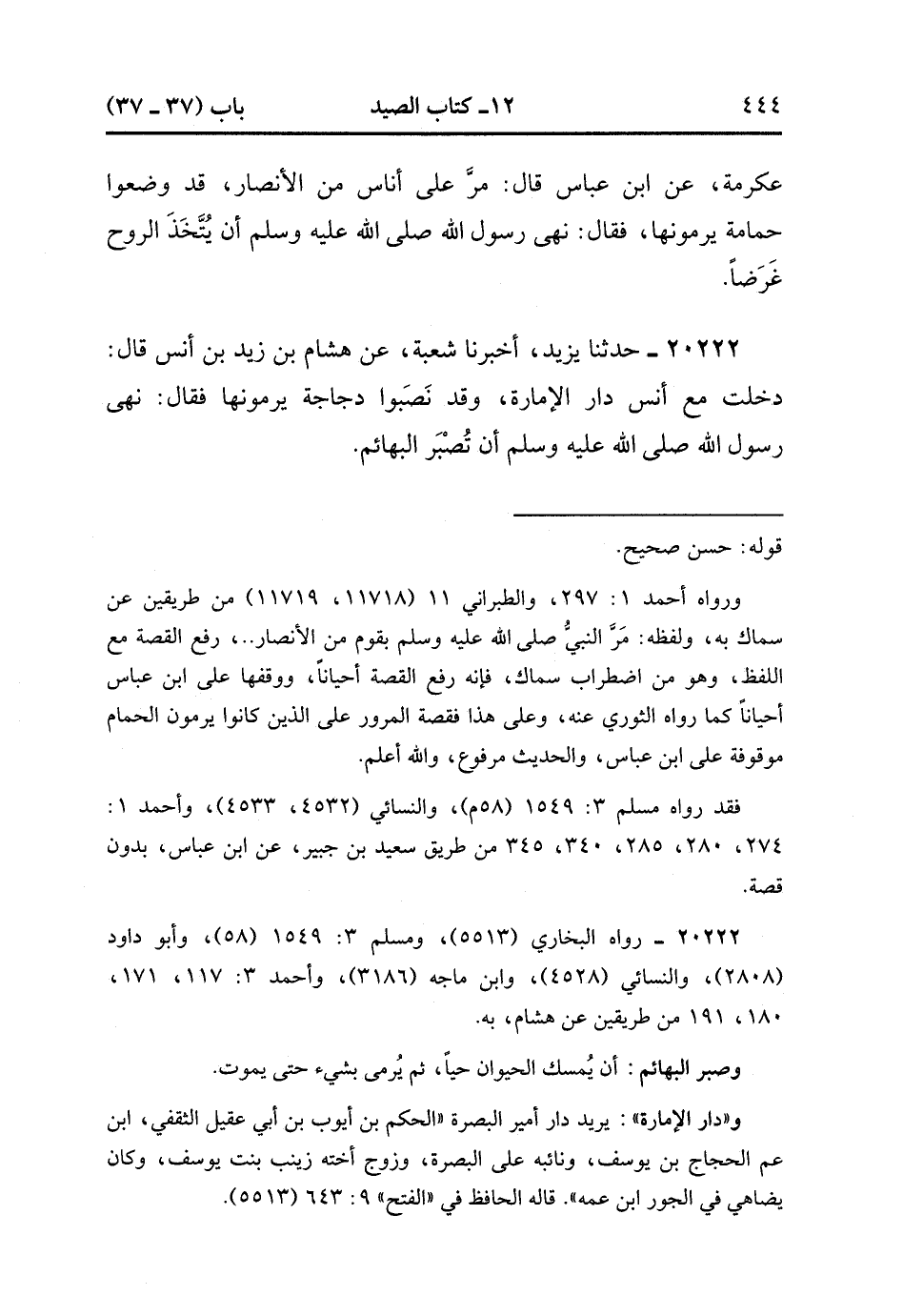 20222- حَدَّثَنَا يَزِيدُ ، أَخْبَرَنَا شُعْبَةُ ، عَنْ هِشَامِ بْنِ زَيْدِ بْنِ أَنَسٍ ، قَالَ : دَخَلْت مَعَ أَنَسٍ دَارَ الإِمَارَةِ وَقَدْ نَصَبُوا دَجَاجَةً يَرْمُونَهَا ، فَقَالَ : نَهَى رَسُولُ اللهِ صَلَّى الله عَلَيْهِ وَسَلَّمَ أَنْ تُصَبَّرَ الْبَهَائِمُ. (5/398).