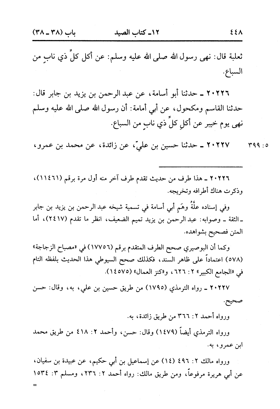 20227- حَدَّثَنَا حُسَيْنُ بْنُ عَلِيٍّ ، عَنْ زَائِدَةَ ، عَنْ مُحَمَّدِ بْنِ عَمْرٍو ، عَنْ أَبِي سَلَمَةَ ، عَنْ أَبِي هُرَيْرَةَ ، أَنَّ رَسُولَ اللهِ حَرَّمَ يَوْمَ خَيْبَرَ كُلَّ ذِي نَابٍ مِنَ السِّبَاعِ. (5/399).
