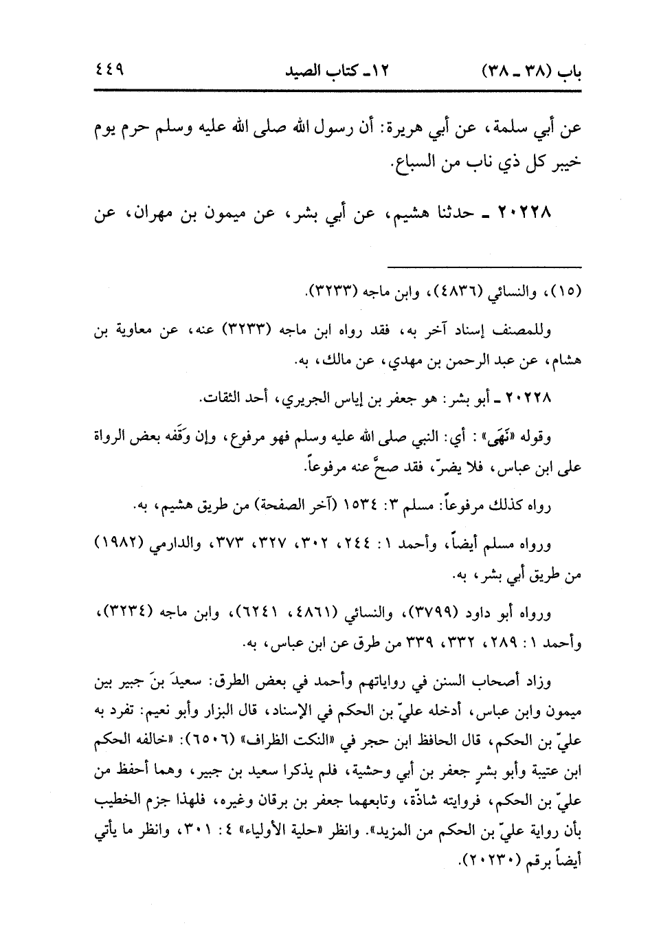 20228- حَدَّثَنَا هُشَيْمٌ ، عَنْ أَبِي بِشْرٍ ، عَنْ مَيْمُونِ بْنِ مِهْرَانَ ، عَنِ ابْنِ عَبَّاسٍ ، قَالَ : نَهَى عَنْ كُلِّ ذِي نَابٍ مِنَ السِّبَاعِ ، وَعَنْ كُلِّ ذِي مِخْلَبٍ مِنَ الطَّيْرِ. (5/399).