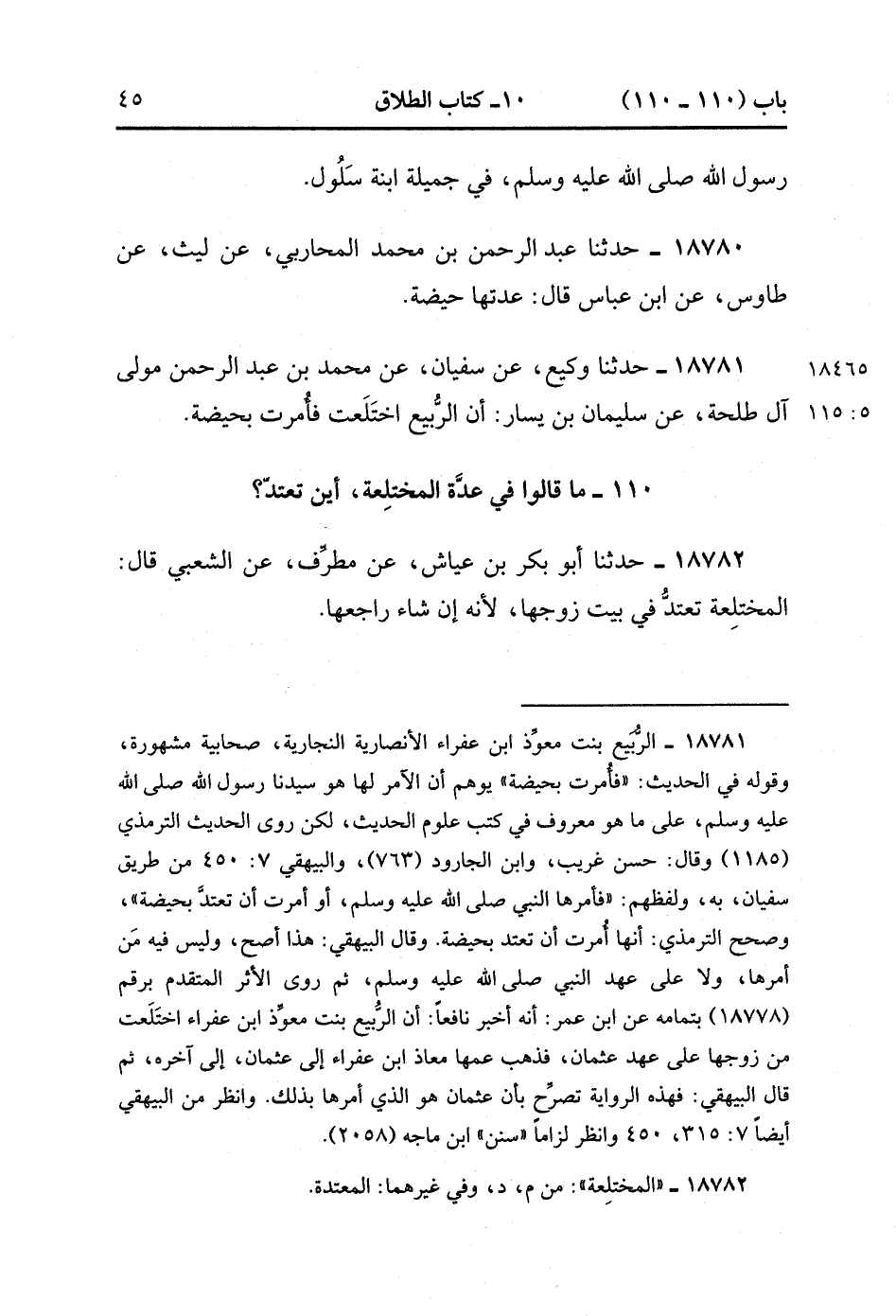 18781- حَدَّثَنَا وَكِيعٌ ، عَنْ سُفْيَانَ ، عَنْ مُحَمَّدِ بْنِ عَبْدِ الرَّحْمَنِ ، مَوْلَى آلِ طَلْحَةَ ، عَنْ سُلَيْمَانَ بْنِ يَسَارٍ ؛ أَنَّ الرُّبَيِّعَ اخْتَلَعَتْ فَأُمِرَتْ بِحَيْضَةٍ. (5/114).