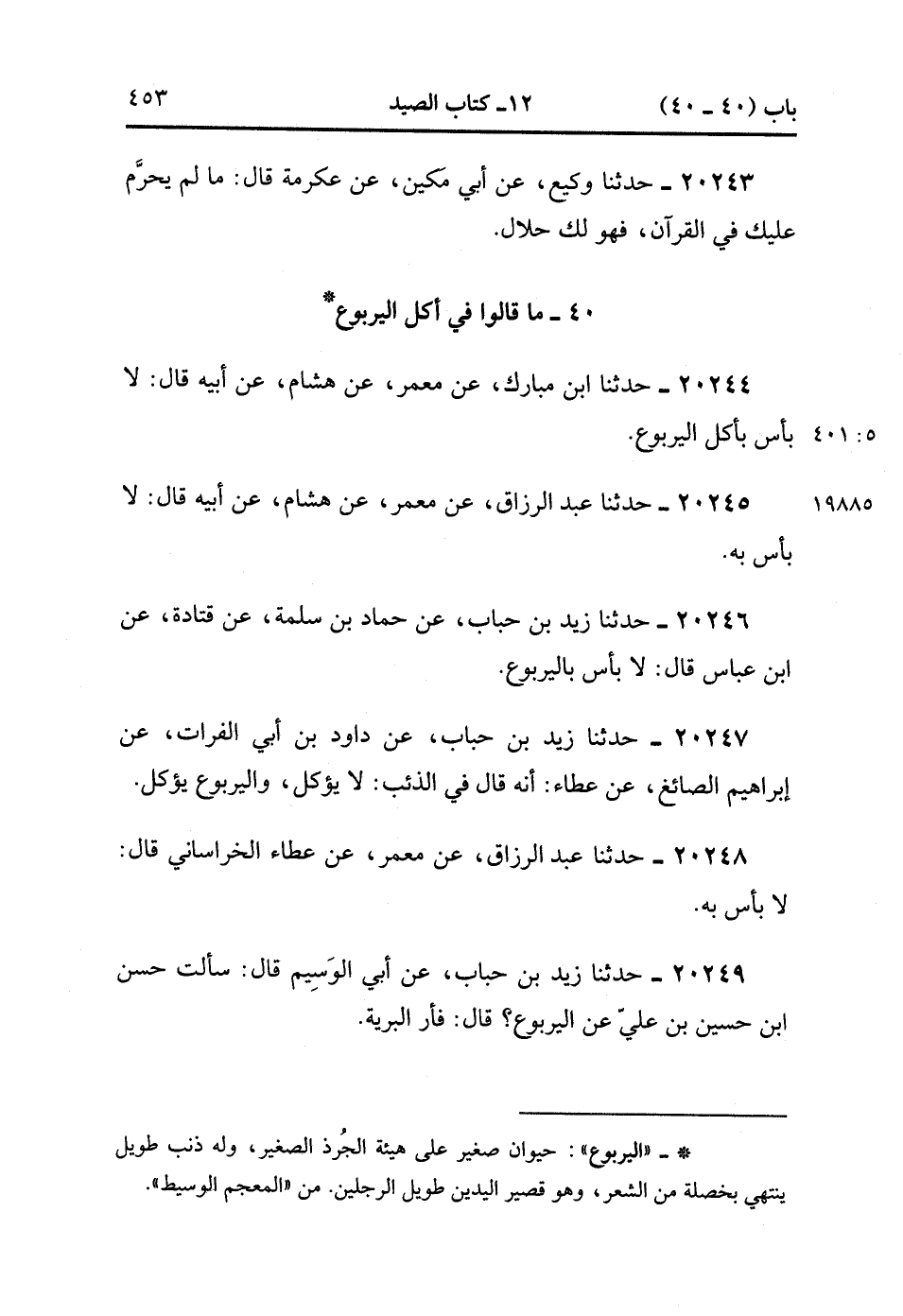 20249- حَدَّثَنَا زَيْدُ بْنُ الْحُبَابِ ، عَنْ أَبِي الْوَسِيمِ ، قَالَ : سَأَلَتْ حَسَنَ بْنَ حُسَيْنِ بْنِ عَلِيٍّ ، عَنِ الْيَرْبُوعِ ، قَالَ : فَأْرُ الْبَرِّيَّةِ. (5/401).