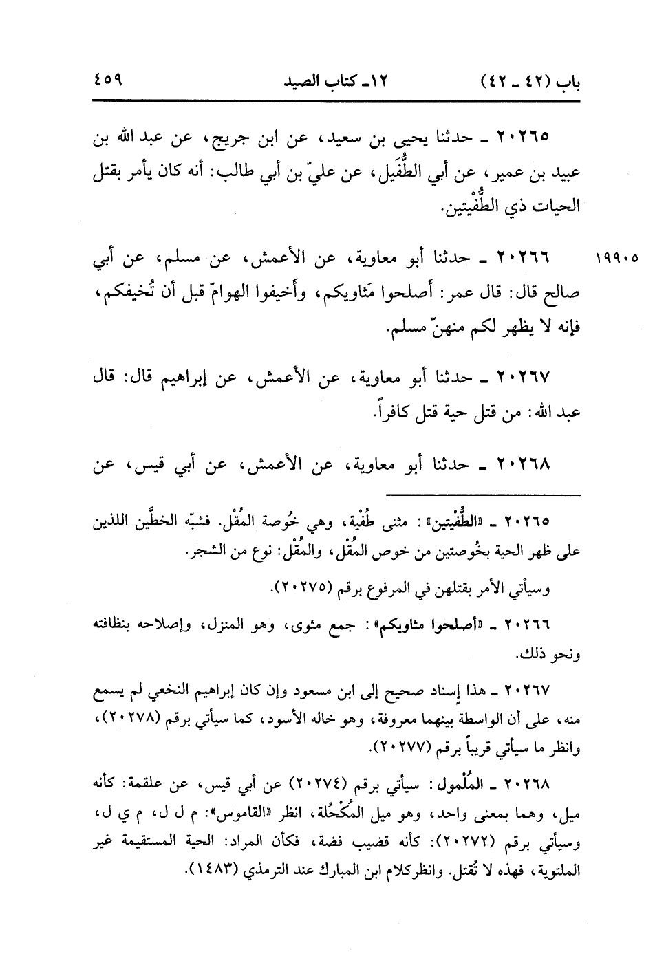20267- حَدَّثَنَا أَبُو مُعَاوِيَةَ ، عَنِ الأَعْمَشِ ، عَنْ إبْرَاهِيمَ ، قَالَ : قَالَ عَبْدُ اللهِ : مَنْ قَتَلَ حَيَّةً قَتَلَ كَافِرًا.
