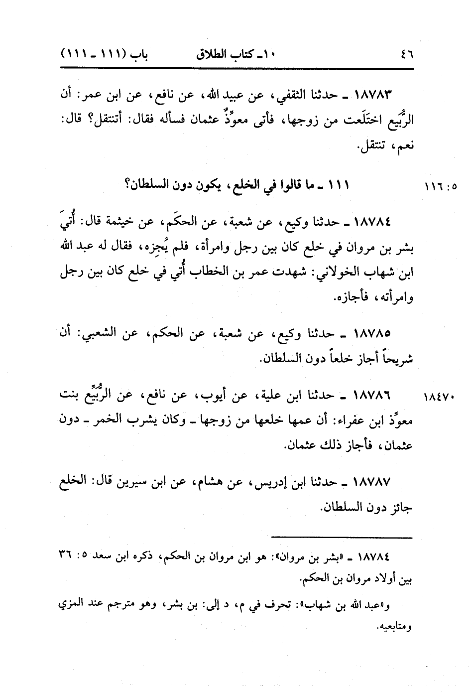 18787- حَدَّثَنَا ابْنُ إدْرِيسَ ، عَنْ هِشَامٍ ، عَنِ ابْنِ سِيرِينَ ، قَالَ : الْخُلْعُ جَائِزٌ دُونُ السُّلْطَانِ. (5/116).