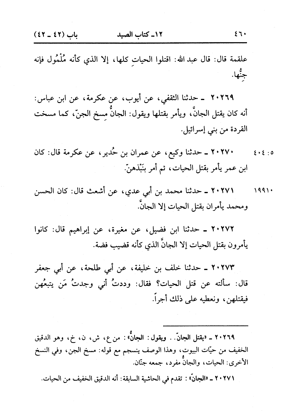 20269- حدَّثنا الثَّقَفِي ، عن أَيُّوبَ ، عَنْ عِكْرِمَةَ ، عَنِ ابْنِ عَبَّاسٍ ؛ أَنَّهُ كَانَ يَقْتُلُ الْجَانَّ ، وَيَأْمُرُ بِقَتْلِهَا ، وَيَقُولُ : الْجَانُّ مَسْخُ الْجِنِّ ، كَمَا مُسِخَتِ الْقِرَدَةُ مِنْ بَنِي إِسْرَائِيلَ. (5/403).