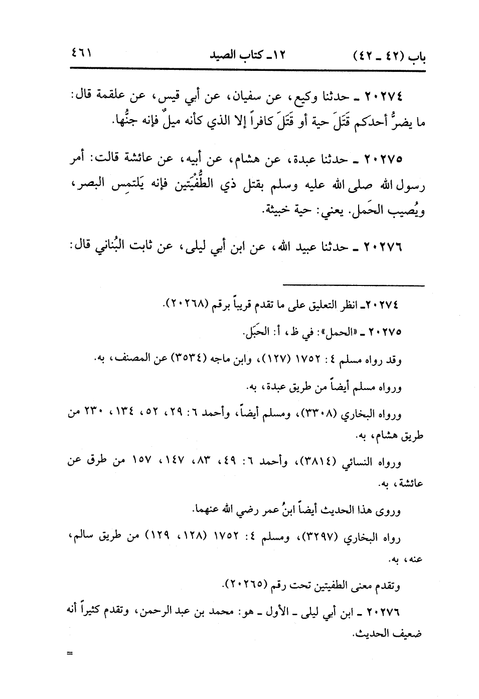 20275- حَدَّثَنَا عَبْدَةُ ، عَنْ هِشَامٍ ، عَنْ أَبِيهِ ، عَنْ عَائِشَةَ ، قَالَتْ : أَمَرَ رَسُولُ اللهِ صَلَّى الله عَلَيْهِ وَسَلَّمَ بِقَتْلِ ذِي الطفيتين ، فَإِنَّهُ يَلْتمس الْبَصَرَ , وَيُصِيبُ الْحَمْلَ ، يَعْنِي حَيَّةً خَبِيثَةً. (5/404).
