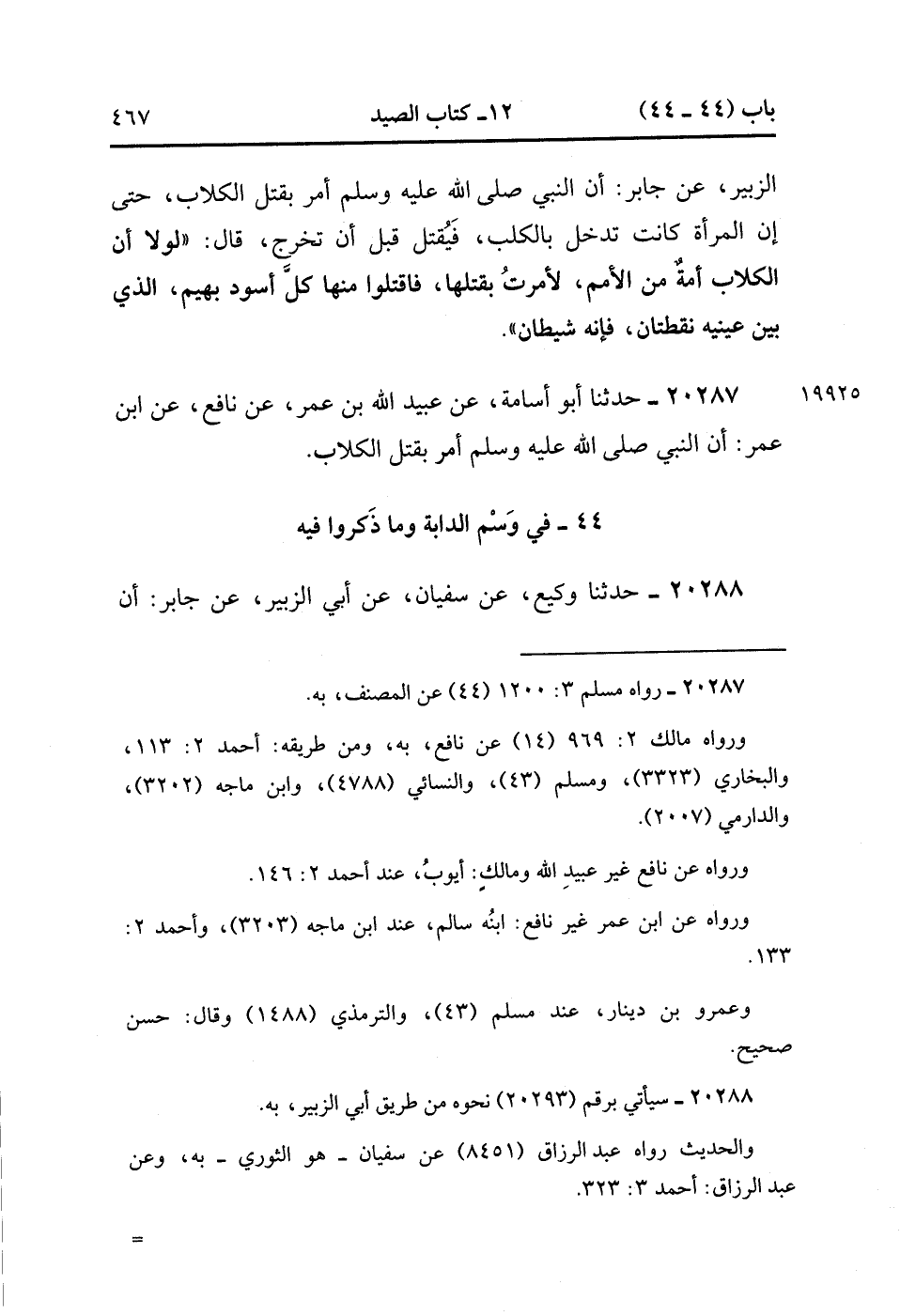 20287- حَدَّثَنَا أَبُو أُسَامَةَ ، عَنْ عُبَيْدِ اللهِ بْنِ عُمَرَ ، عَنْ نَافِعٍ ، عَنِ ابْنِ عُمَرَ ، أَنَّ النَّبِيَّ صَلَّى الله عَلَيْهِ وَسَلَّمَ أَمَرَ بِقَتْلِ الْكِلاَبِ.