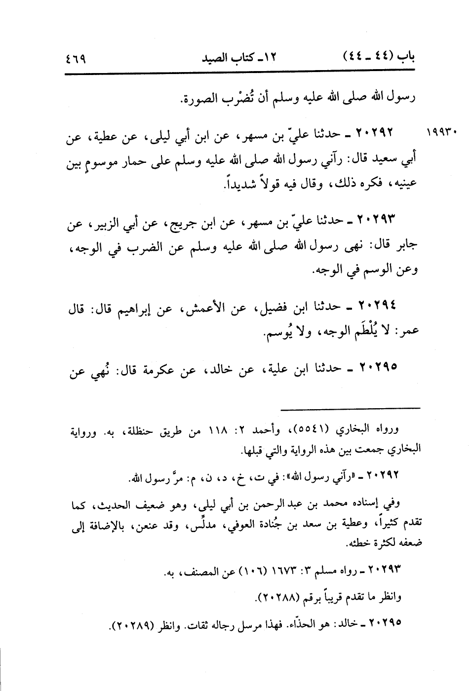 20293- حَدَّثَنَا عَلِيُّ بْنُ مُسْهِرٍ ، عَنِ ابْنِ جُرَيْجٍ ، عَنْ أَبِي الزُّبَيْرِ ، عَنْ جَابِرٍ ، قَالَ : نَهَى رَسُولُ اللهِ صَلَّى الله عَلَيْهِ وَسَلَّمَ عَنِ الضَّرْبِ فِي الْوَجْهِ ، وَعَنِ الْوَسْمِ فِي الْوَجْهِ.