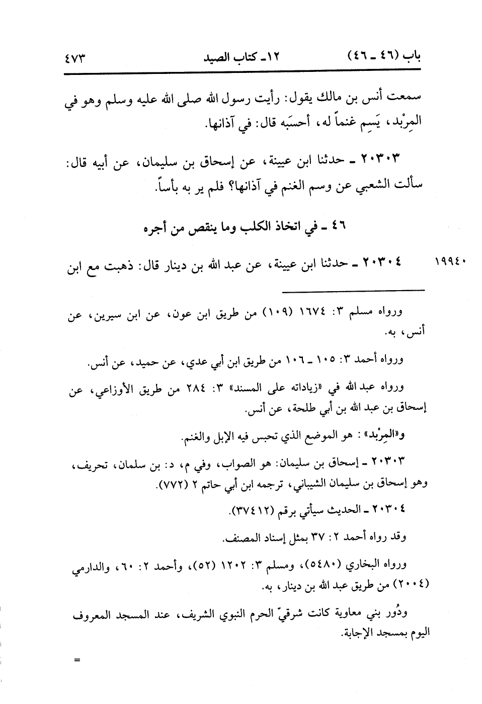 20304- حَدَّثَنَا ابْنُ عُيَيْنَةَ ، عَنْ عَبْدِ اللهِ بْنِ دِينَارٍ ، قَالَ : ذَهَبْت مَعَ ابْنِ عُمَرَ إلَى بَنِي مُعَاوِيَةَ فَنَبَحَتْ عَلَيْنَا كِلاَبٌ ، فَقَالَ : قَالَ رَسُولُ اللهِ صَلَّى الله عَلَيْهِ وَسَلَّمَ : مَنِ اقْتَنَى كَلْبًا إِلاَّ كَلْبَ ضَارِيَةٍ ، أَوْ مَاشِيَةٍ نَقَصَ مِنْ أَجْرِهِ كُلَّ يَوْمٍ قِيرَاطَانِ. (5/408).