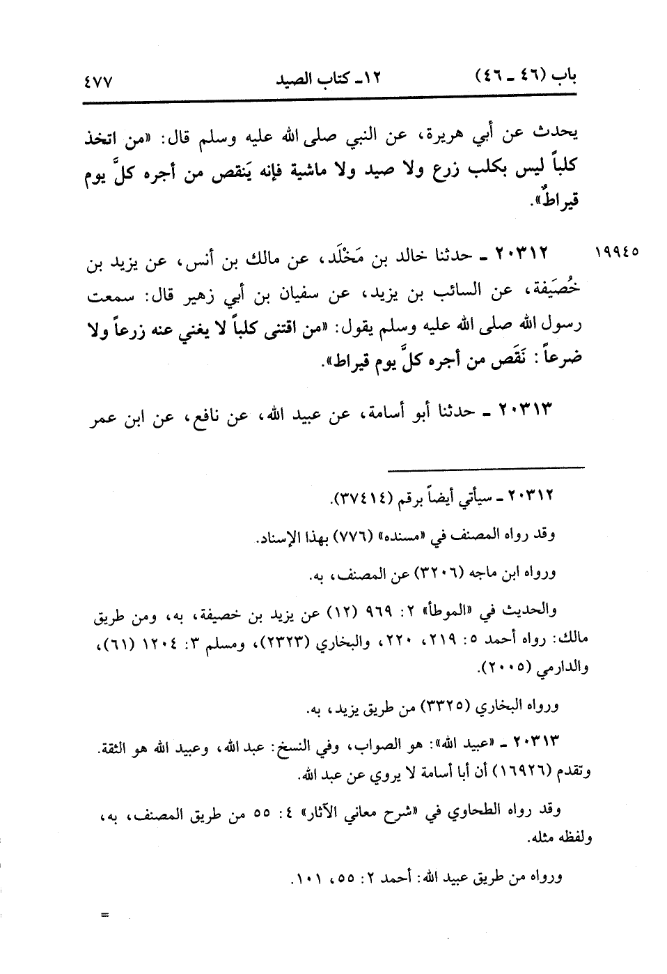 20313- حَدَّثَنَا أَبُو أُسَامَةَ ، عَنْ عُبَيْدِ اللهِ ، عَنْ نَافِعٍ ، عَنِ ابْنِ عُمَرَ ، قَالَ : قَالَ رَسُولُ اللهِ صَلَّى الله عَلَيْهِ وَسَلَّمَ : مَنِ اقْتَنَى كَلْبًا نَقَصَ مِنْ أَجْرِهِ كُلَّ يَوْمٍ قِيرَاطٌ. (5/409).