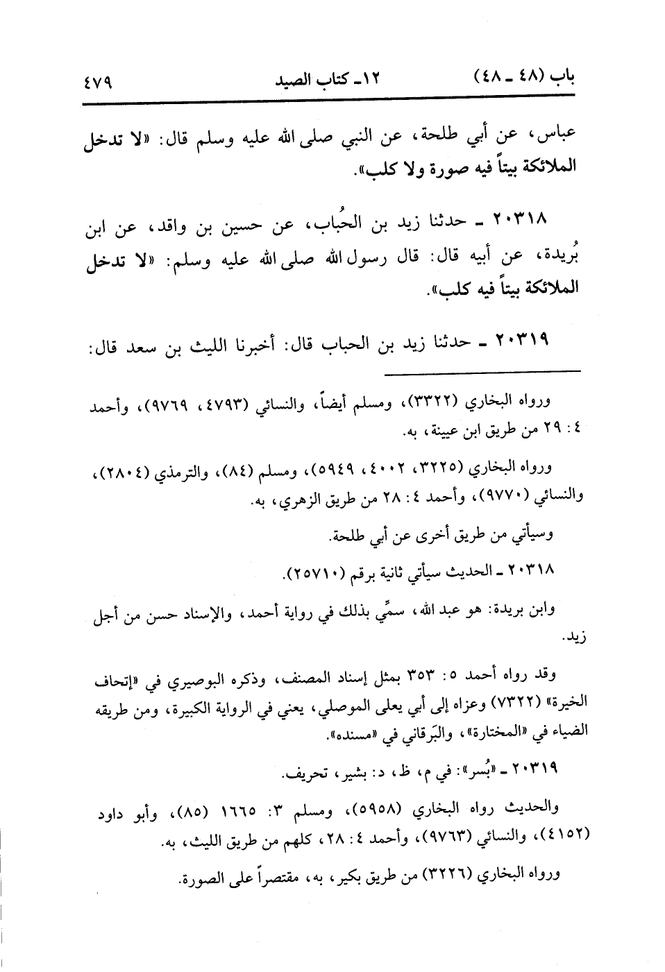 20318- حَدَّثَنَا زَيْدُ بْنُ الْحُبَابِ ، عَنْ حُسَيْنِ بْنِ وَاقِدٍ ، عَنِ ابْنِ بُرَيْدَةَ ، عَنْ أَبِيهِ ، قَالَ : قَالَ رَسُولُ اللهِ صَلَّى الله عَلَيْهِ وَسَلَّمَ : لاَ تَدْخُلُ الْمَلاَئِكَةُ بَيْتًا فِيهِ كَلْبٌ. (5/410).