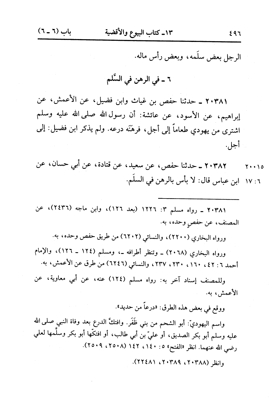 20381- حَدَّثَنَا حَفْصُ بْنُ غِيَاثٍ ، وَابْنُ فُضَيْلٍ ، عَنِ الأَعْمَشِ ، عَنْ إبْرَاهِيمَ ، عَنِ الأَسْوَدِ ، عَنْ عَائِشَةَ ، أَنَّ رَسُولَ اللهِ صَلَّى الله عَلَيْهِ وَسَلَّمَ اشْتَرَى مِنْ يَهُودِيٍّ طَعَامًا إلَى أَجَلٍ فَرَهَنَهُ دِرْعَهُ وَلَمْ يَذْكُرِ ابْنُ فُضَيْلٍ : إلَى أَجَلٍ. (6/16).