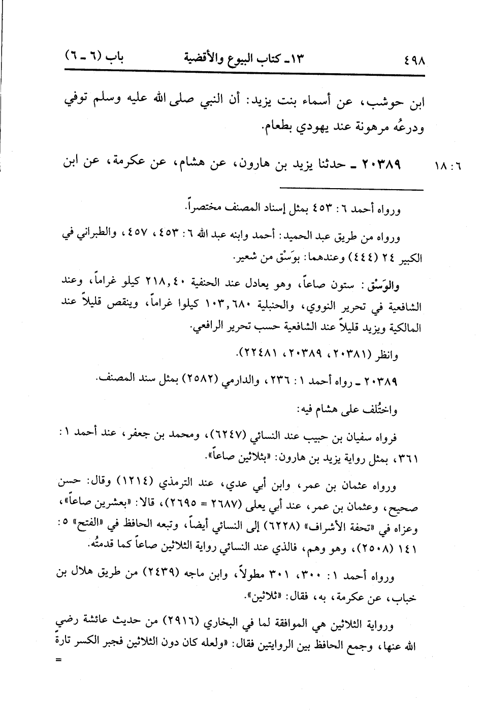 20389- حَدَّثَنَا يَزِيدُ بْنُ هَارُونَ ، عَنْ هِشَامٍ ، عَنْ عِكْرِمَةَ ، عَنِ ابْنِ عَبَّاسٍ ، قَالَ : قبِضَ رَسُولُ اللهِ صَلَّى الله عَلَيْهِ وَسَلَّمَ , وَإِنَّ دِرْعَهُ مَرْهُونَةٌ بِثَلاَثِينَ صَاعًا مِنْ شَعِيرٍ أَخَذَهَا رِزْقًا لِعِيَالِهِ. (6/18).