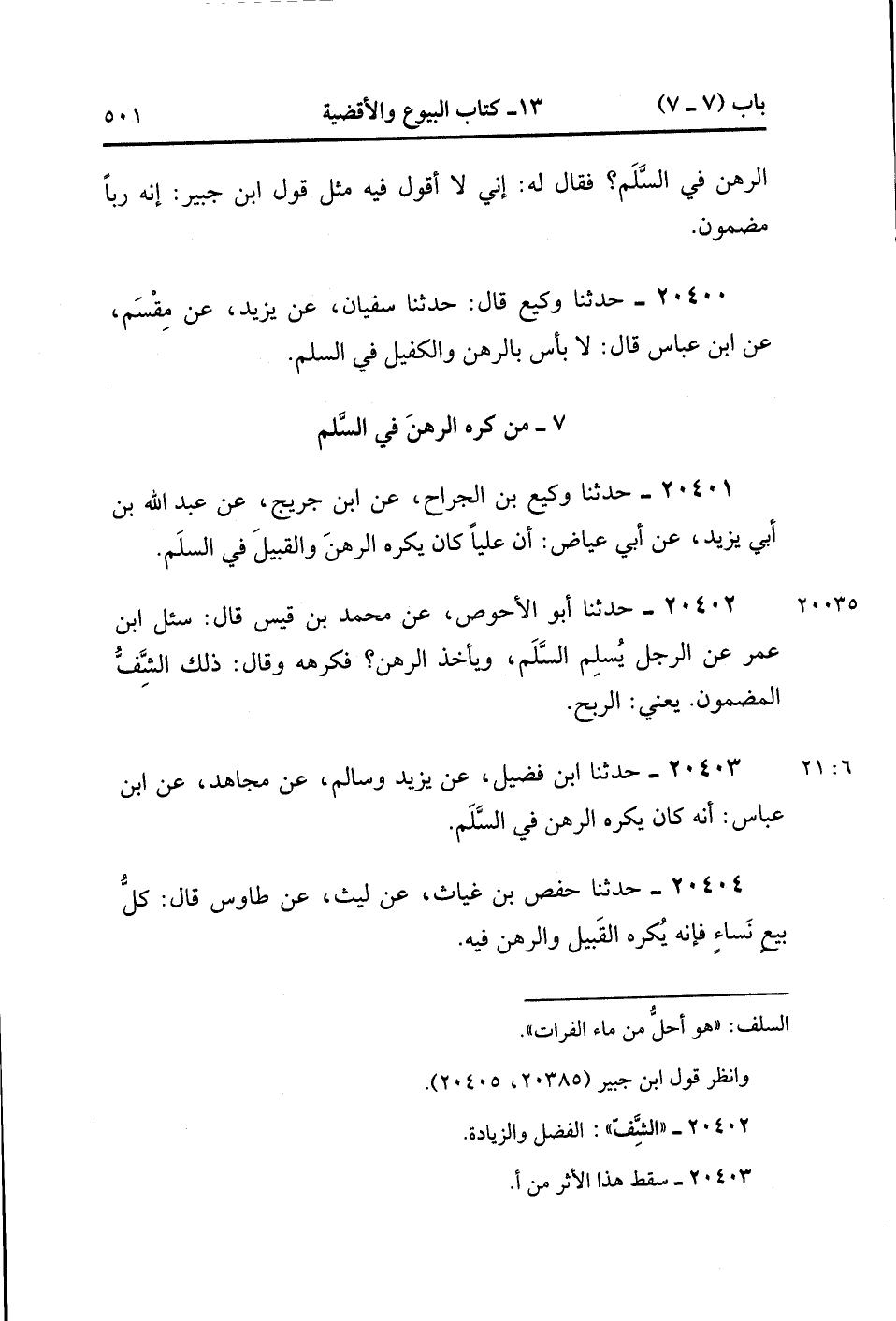 20402- حَدَّثَنَا أَبُو الأَحْوَصِ ، عَنْ مُحَمَّدِ بْنِ قَيْسٍ ، قَالَ : سُئِلَ ابْنُ عُمَرَ عَنِ الرَّجُلِ يُسْلِمُ السَّلَمَ وَيَأْخُذُ الرَّهْنَ فَكَرِهَهُ ، وَقَالَ : ذَلِكَ الشَّفُّ الْمَضْمُونُ ، يَعْنِي الرِّبْحَ. (6/20).