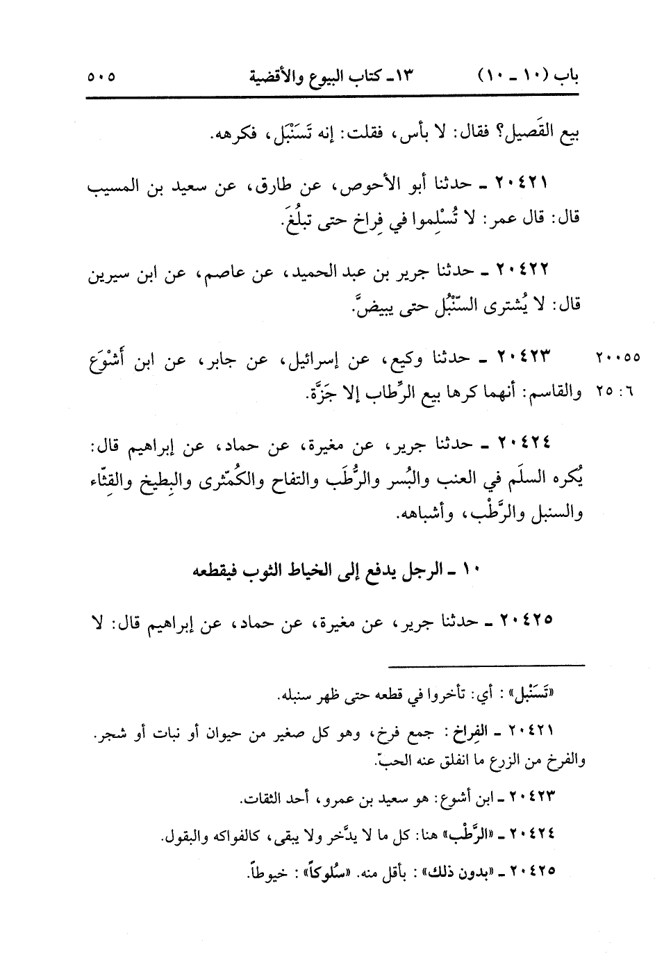 20422- حَدَّثَنَا جَرِيرُ بْنُ عَبْدِ الْحَمِيدِ ، عَنْ عَاصِمٍ ، عَنِ ابْن سِيرِينَ ، قَالَ : لاَ يُشْتَرَى السُّنْبُلُ حَتَّى يَبْيَضَّ. (6/24).