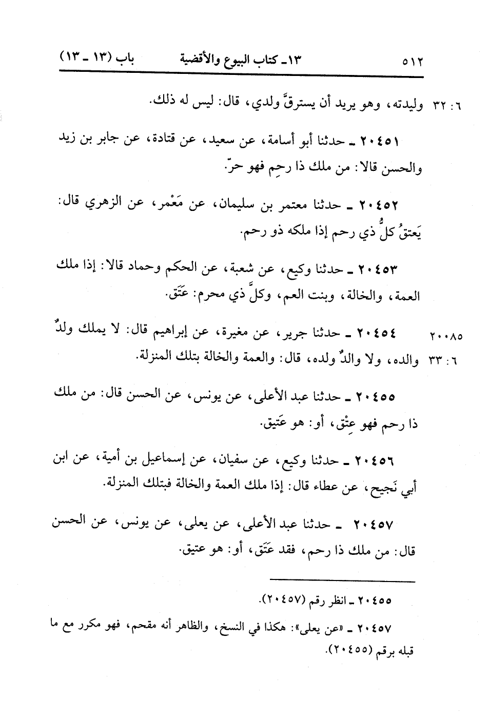 20454- حَدَّثَنَا جَرِيرٌ ، عَنْ مُغِيرَةَ ، عَنْ إبْرَاهِيمَ ، قَالَ : لاَ يَمْلِكُ وَلَدٌ وَالِدَهُ ، وَلاَ وَالِدٌ وَلَدَهُ ، قَالَ : وَالْعَمَّةُ وَالْخَالَةُ بِتِلْكَ الْمَنْزِلَةِ. (6/32).