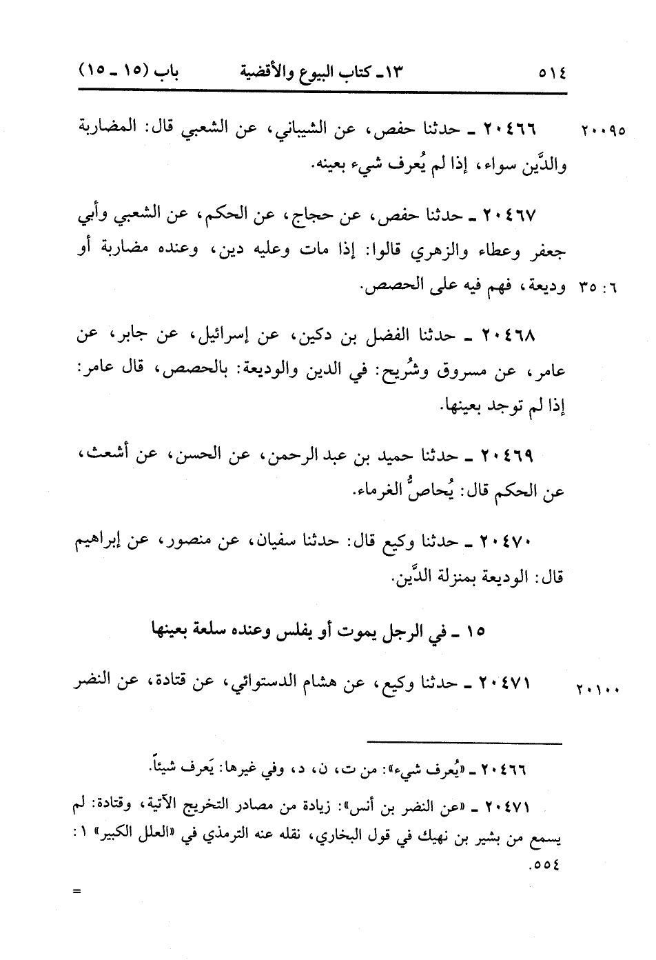20467- حَدَّثَنَا حَفْصٌ ، عَنْ حَجَّاجٍ ، عَنِ الْحَكَمِ ، عَنِ الشَّعْبِيِّ ، وَأَبِي جَعْفَرٍ ، وَعَطَاءٍ وَالزُّهْرِيِّ قَالُوا : إذَا مَاتَ وَعَلَيْهِ دَيْنٌ وَعِنْدَهُ مُضَارَبَةٌ ، أَوْ وديعة فَهُمْ فِيهِ عَلَى الْحِصَصِ. (6/34).