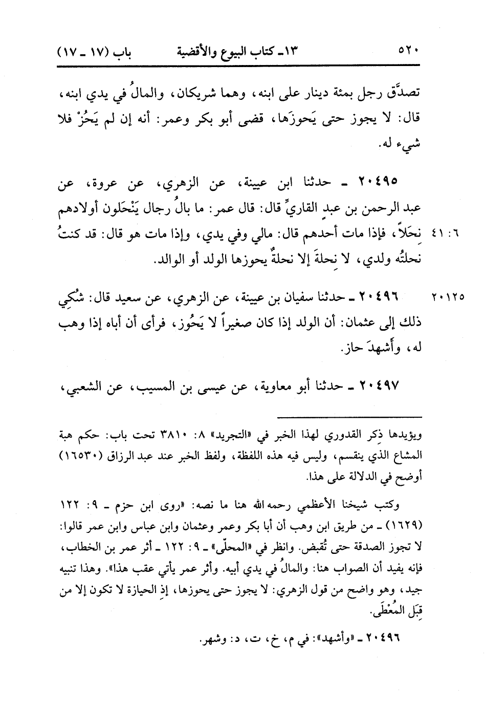 20495- حَدَّثَنَا ابْنُ عُيَيْنَةَ ، عَنِ الزُّهْرِيِّ ، عَنْ عُرْوَةَ ، عَنْ عَبْدِ الرَّحْمَنِ بْنِ عَبْدٍ الْقَارِي ، قَالَ : قَالَ عُمَرُ : مَا بَالُ رِجَالٍ يَنْحَلُونَ أَوْلاَدَهُمْ نِحَلاً ، فَإِذَا مَاتَ أَحَدَهُمْ ، قَالَ : مَالِي وَفِي يَدِي ، وَإِذَا مَاتَ هُوَ ، قَالَ : قَدْ كُنْتُ نَحَلْتُهُ وَلَدِي ، لاَ نَحْلَةَ إلاَّ نِحْلَةٌ يَحُوزُهَا الْوَلَدُ أو الْوَالِدِ. (6/40).