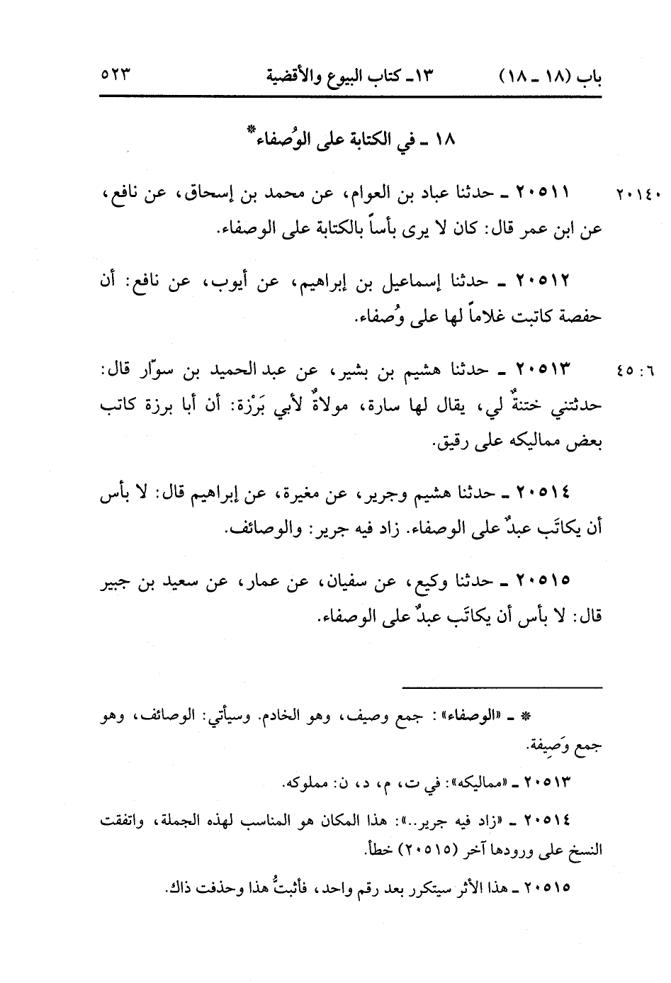 20514- حَدَّثَنَا هُشَيْمٌ وَجَرِيرٌ ، عَنْ مُغِيرَةَ ، عَنْ إبْرَاهِيمَ ، قَالَ : لاَ بَأْسَ أَنْ يُكَاتَبَ عَبْدٌ عَلَى الْوُصَفَاءِ.