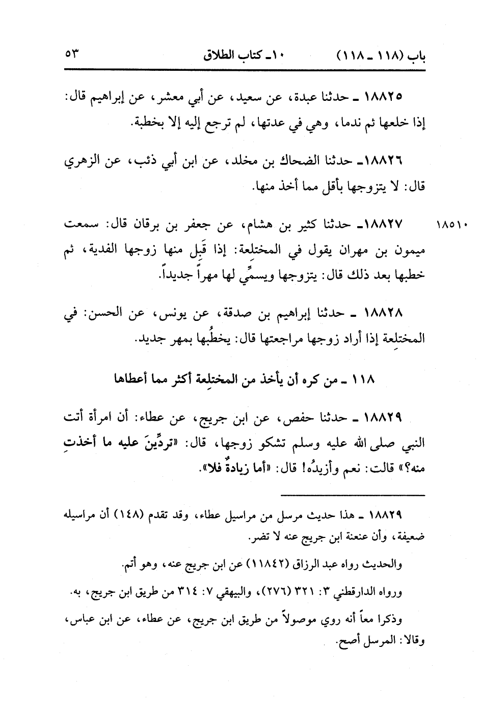 18829- حَدَّثَنَا حَفْصٌ ، عَنِ ابْنِ جُرَيْجٍ ، عَنْ عَطَاءٍ ؛ أَنَّ امْرَأَةً أَتَتِ النَّبِيَّ صَلَّى الله عَلَيْهِ وَسَلَّمَ تَشْكُو زَوْجَهَا ، قَالَ : تَرُدِّينَ عَلَيْهِ مَا أَخَذْتِ مِنْهُ ؟ قَالَتْ : نَعَمْ ، وَأَزِيدُهُ ، قَالَ : أَمَّا زِيَادَةً فَلاَ. (5/122).