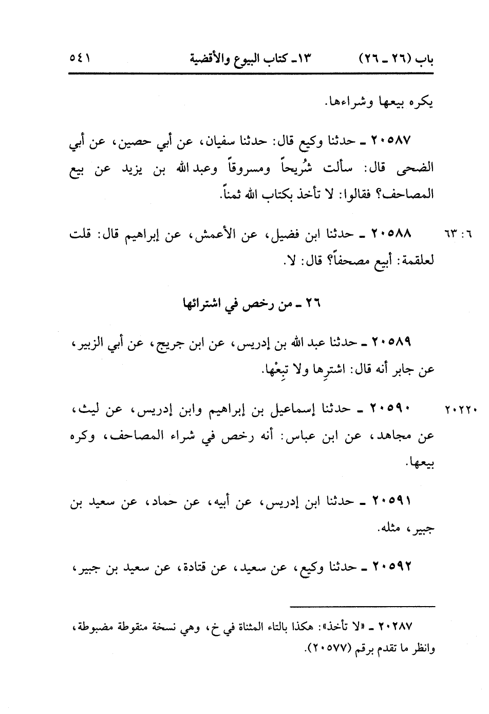 20587- حَدَّثَنَا وَكِيعٌ , قَالَ : حدَّثَنَا سُفْيَانُ ، عَنْ أَبِي حَصِينٍ ، عَنْ أَبِي الضُّحَى ، قَالَ : سَأَلْتُ شُرَيْحًا وَمَسْرُوقًا ، وَعَبْدَ اللهِ بْنَ يَزِيدَ ، عَنْ بَيْعِ الْمَصَاحِفِ فَقَالُوا : لاَ تَأْخُذُ بِكِتَابِ اللهِ ثَمَنًا. (6/62).