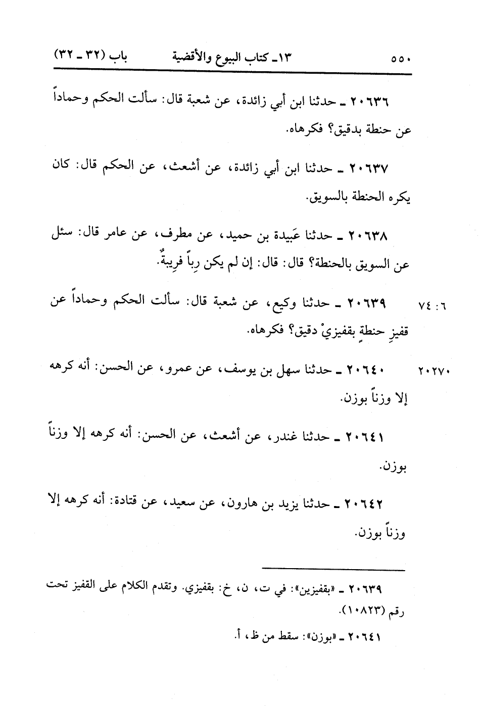 20637- حَدَّثَنَا ابْنُ أَبِي زَائِدَةَ ، عَنْ أَشْعَثَ ، عَنِ الْحَكَمِ ، قَالَ : كَانَ يَكْرَهُ الْحِنْطَةَ بِالسَّوِيقِ.