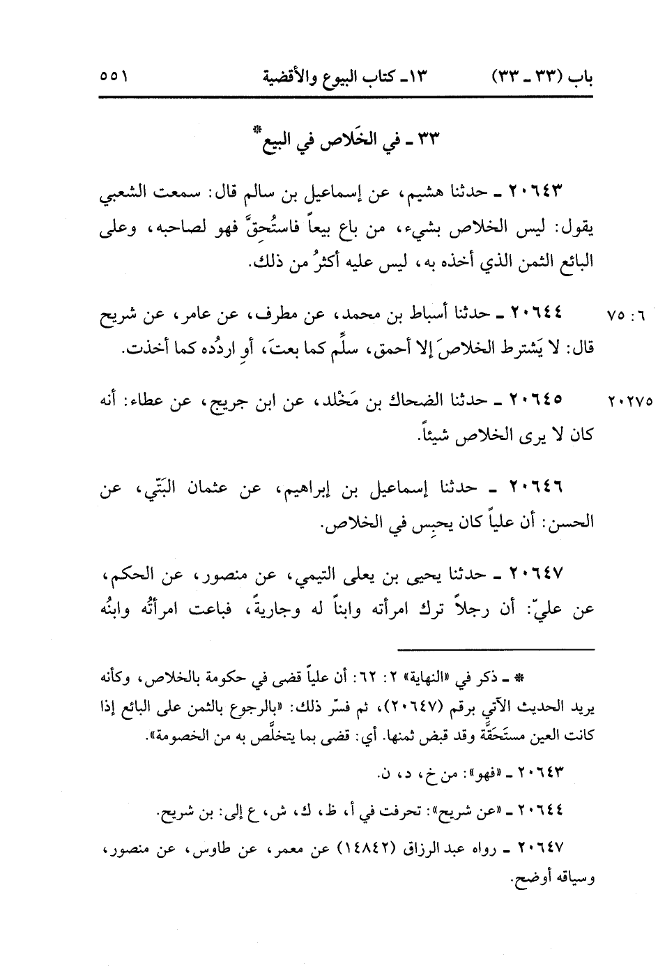 20643- حَدَّثَنَا هُشَيْمٌ ، عَنْ إسْمَاعِيلَ بْنِ سَالِمٍ ، قَالَ : سَمِعْتُ الشَّعْبِيَّ يَقُولُ : لَيْسَ الْخَلاَصُ بِشَيْءٍ ، مَنْ بَاعَ بَيْعًا فاسْتُحِقَّ فهو لِصَاحِبِهِ ، وَعَلَى الْبَائِعِ الثمنِ الَّذِي أَخَذَهُ بِهِ ، لَيْسَ عَلَيْهِ أَكْثَرُ مِنْ ذَلِكَ. (6/74).