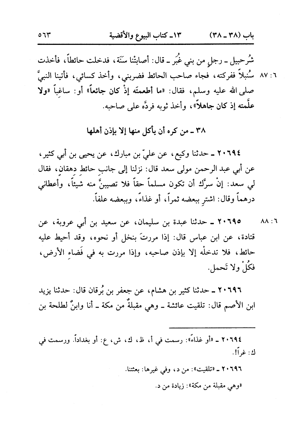 20694- حَدَّثَنَا وَكِيعٌ ، عَنْ عَلِيِّ بْنِ مُبَارَكٍ ، عَنْ يَحْيَى بْنِ أَبِي كَثِيرٍ ، عَنْ أَبِي عَبْدِ الرَّحْمَنِ مَوْلَى سَعْدٍ ، قَالَ : نَزَلْنَا إلَى جَانِبِ حَائِطِ دِهْقَانٍ فَقَالَ : لِي سَعْدٌ : إِنْ سَرَّك أَنْ تَكُونَ مُسْلِمًا حَقًّا فَلاَ تُصِيبَنَّ مِنْهُ شَيْئًا ، وَأَعْطَانِي دِرْهَمًا ، وَقَالَ : اشْتَرِ بِبَعْضِهِ ثَمْرًا ، أَوْ غذاءً وَبِبَعْضِهِ عَلَفًا. (6/87).