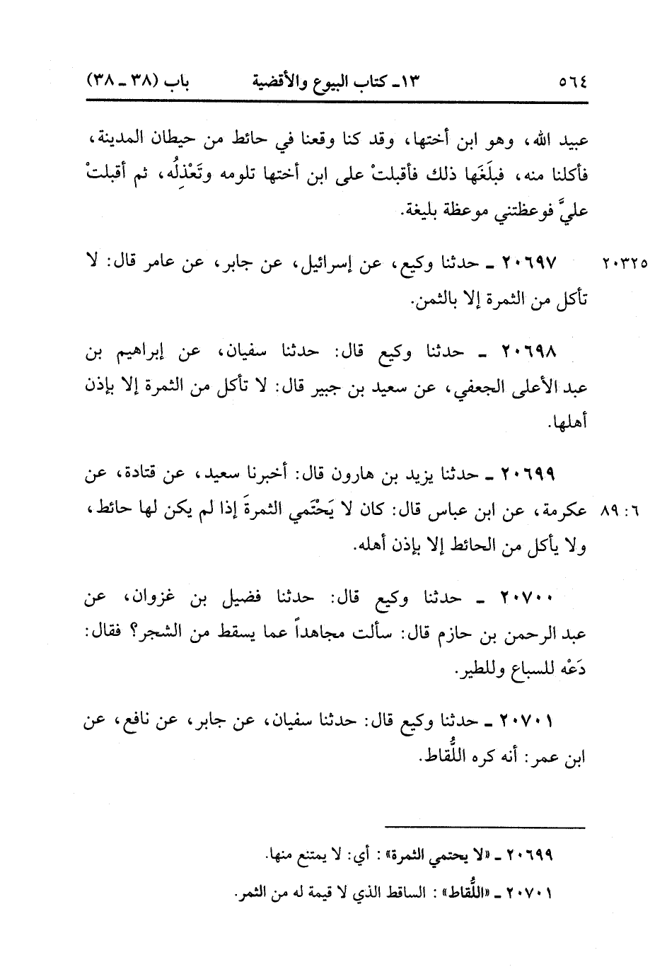 20697- حَدَّثَنَا وَكِيعٌ ، عَنْ إسْرَائِيلَ ، عَنْ جَابِرٍ ، عَنْ عَامِرٍ ، قَالَ : لاَ تَأْكُلْ مِنَ الثَّمَرَةِ إلاَّ بِالثَّمَنِ.