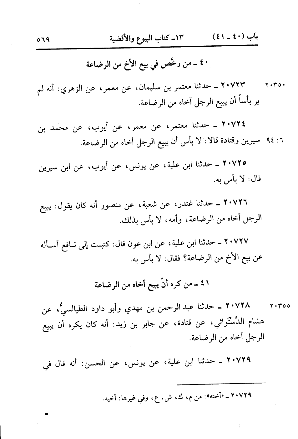20724- حَدَّثَنَا مُعْتَمِرُ ، عَنْ مَعْمَرٍ ، عَنْ أَيُّوبَ ، عَنْ مُحَمَّدِ بْنِ سِيرِينَ وَقَتَادَةَ ، قَالاَ : لاَ بَأْسَ أَنْ يَبِيعَ الرَّجُلُ أَخَاهُ مِنَ الرَّضَاعَةِ. (6/93).