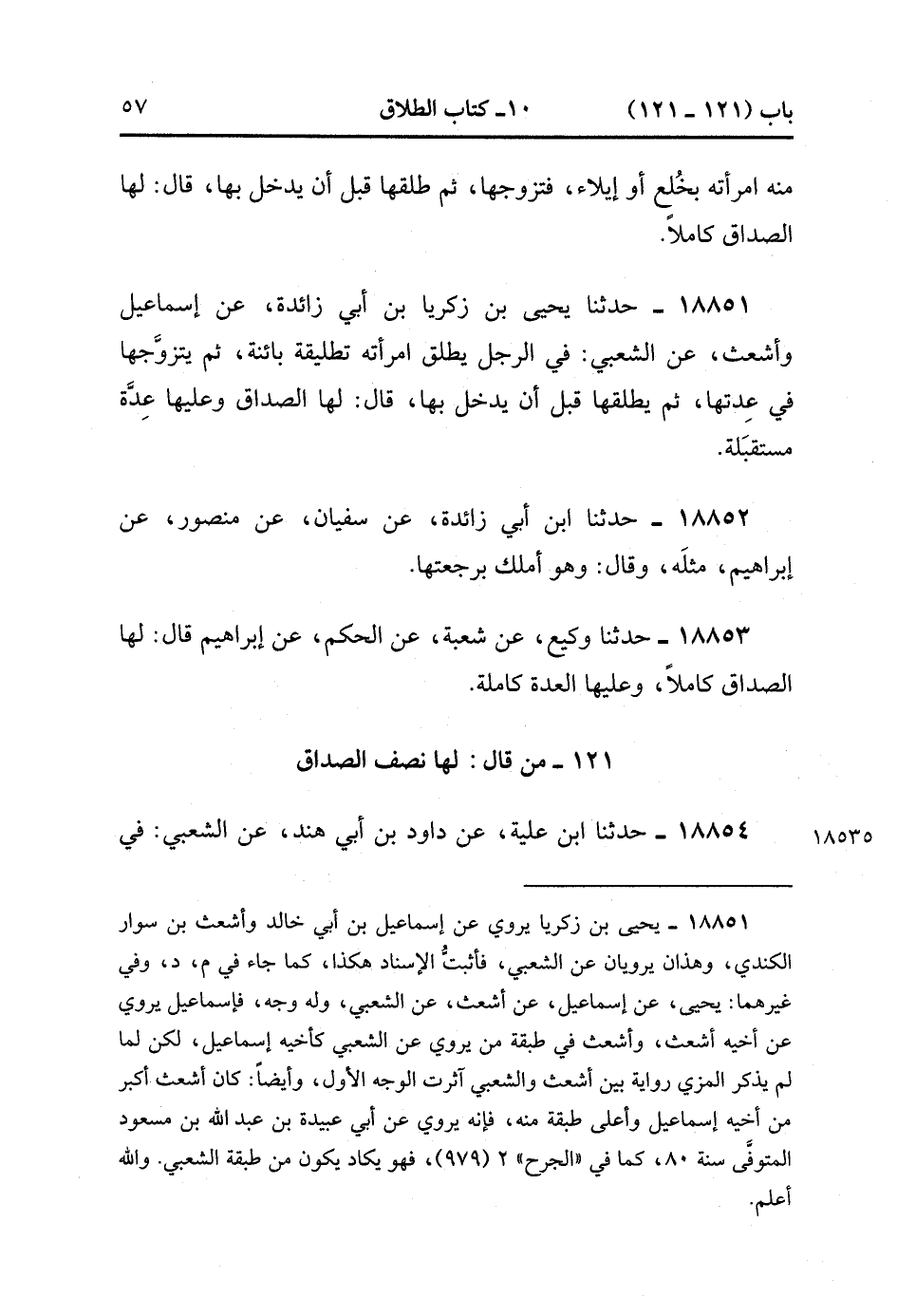 18854- حَدَّثَنَا ابْنُ عُلَيَّةَ ، عَنْ دَاوُدَ بْنِ أَبِي هِنْدٍ ، عَنِ الشَّعْبِيِّ ؛ فِي الْمَرْأَةِ تَبِينُ مِنْ زَوْجِهَا بِتَطْلِيقَةٍ ، أَوْ تَطْلِيقَتَيْنِ ، ثُمَّ يَتَزَوَّجُهَا ، ثُمَّ يُطَلِّقُهَا قَبْلَ أَنْ يَدْخُلَ بِهَا ، قَالَ : لَهَا نِصْفُ الصَّدَاقِ. (5/126).