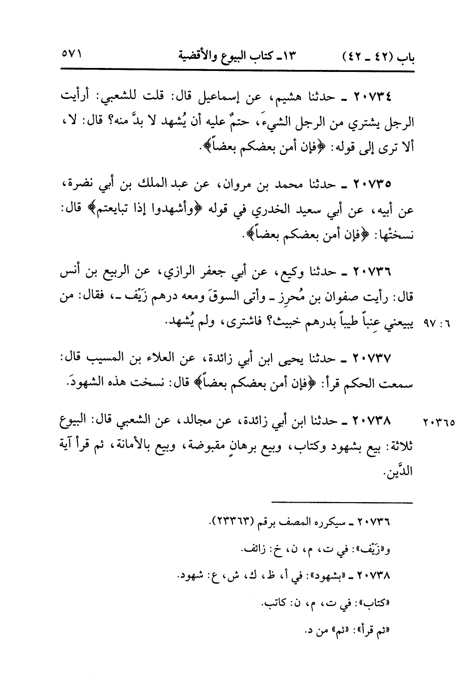 20738- حَدَّثَنَا ابْنُ أَبِي زَائِدَةَ ، عَنْ مُجَالِدٍ ، عَنِ الشَّعْبِيِّ ، قَالَ : الْبُيُوعُ ثَلاَثَةٌ : بَيْعُ شُهُودٍ وَكِتَابٍ وَبَيْعٌ بِرِهَانٍ مَقْبُوضَةٍ ، وَبَيْعٌ بِالأَمَانَةِ ، ثُمَّ قَرَأَ آيَةَ الدَّيْنِ. (6/97).