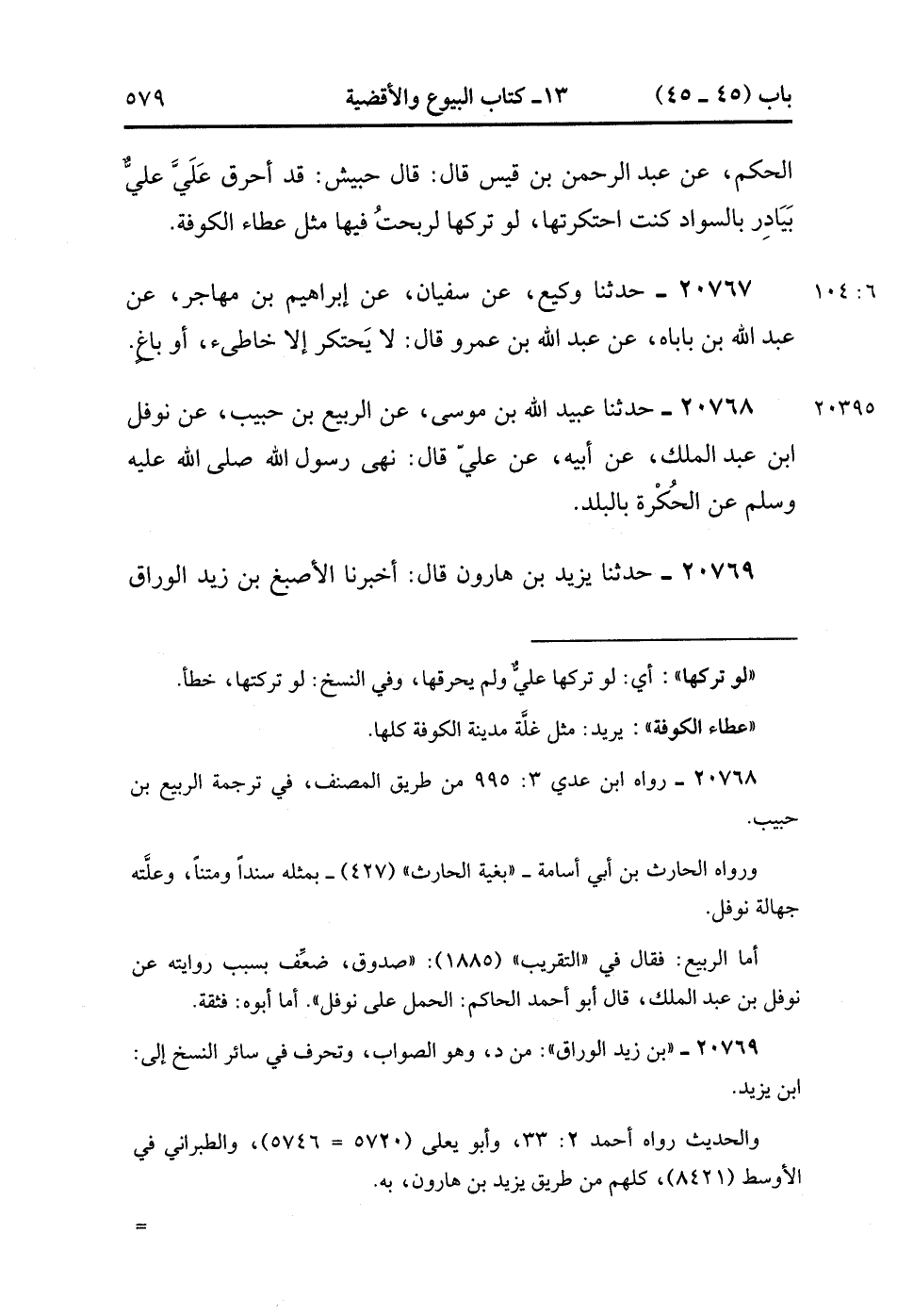 20768- حَدَّثَنَا عُبَيْدُ اللهِ بْنُ مُوسَى ، عَنِ الرَّبِيعِ بْنِ حَبِيبٍ ، عَنْ نَوْفَلِ بْنِ عَبْدِ الْمَلِكِ ، عَنْ أَبِيهِ ، عَنْ عَلِيٍّ ، قَالَ : نَهَى رَسُولُ اللهِ صَلَّى الله عَلَيْهِ وَسَلَّمَ ، عَنِ الْحُكْرَةِ بِالْبَلَدِ. (6/104).