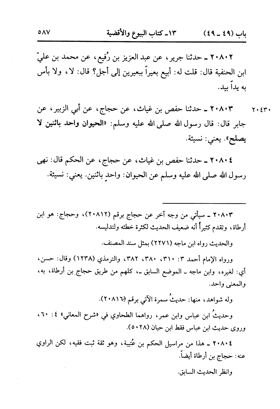 20804- حَدَّثَنَا حَفْصُ بْنُ غِيَاثٍ ، عَنِ الْحَجَّاجِ ، عَنِ الْحَكَمِ ، قَالَ : نَهَى رَسُولُ اللهِ صَلَّى الله عَلَيْهِ وَسَلَّمَ ، عَنِ الْحَيَوَانِ وَاحِدٌ بِاثْنَيْنِ , يَعْنِي نَسِيئَةً. (6/113).