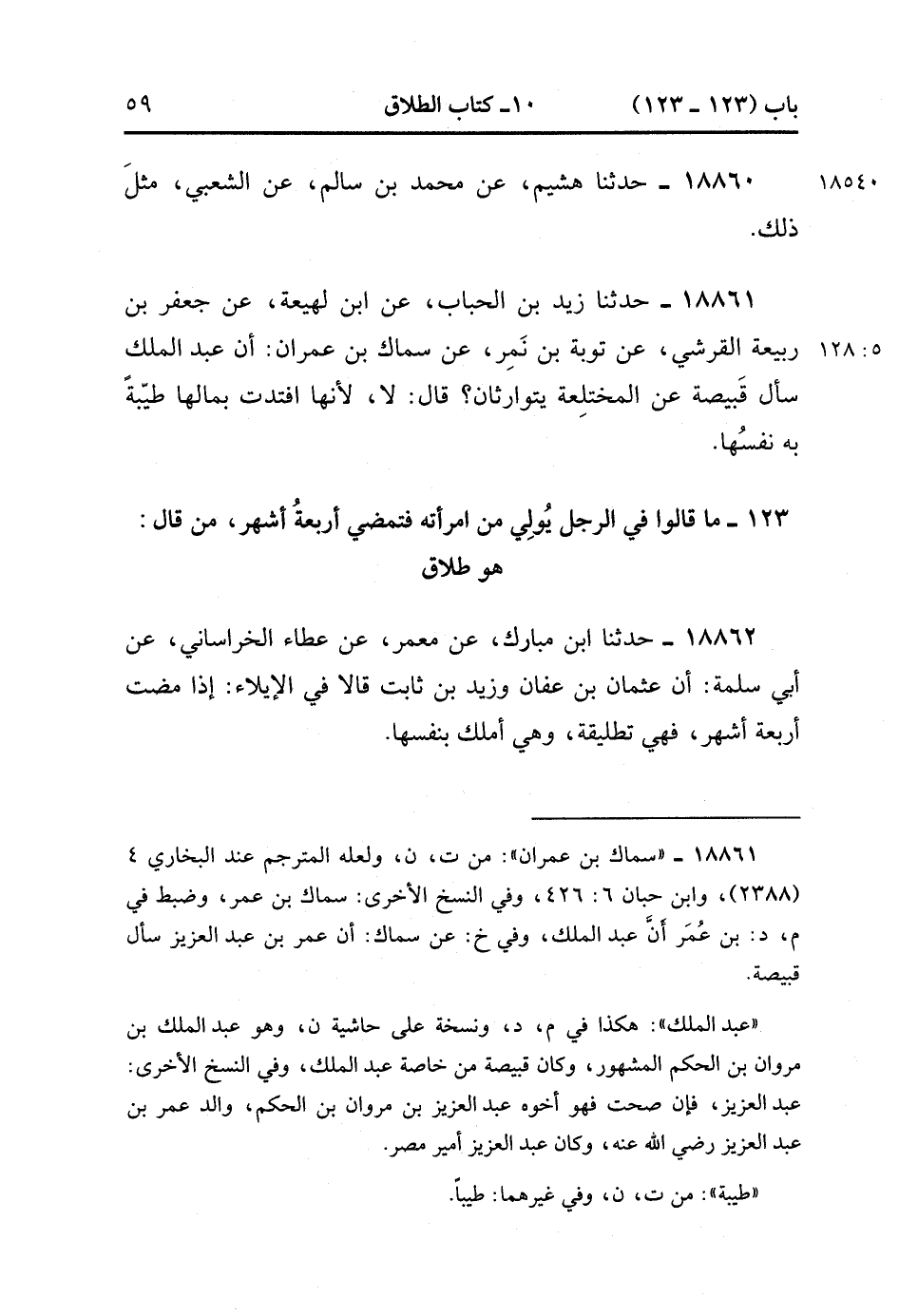 18861- حَدَّثَنَا زَيْدُ بْنُ الْحُبَابِ ، عَنِ ابْنِ لَهِيعَةَ ، عَنْ جَعْفَرٍ بْنِ رَبِيعَةَ الْقُرَشِيِّ ، عَنْ تَوْبَةَ بْنِ نَمِرٍ ، عَنْ سِمَاك بْنِ عِمْرِانٍ ؛ أَنَّ عَبْدَ الْمَلِكَ سَأَلَ قَبِيصَةَ عَنِ الْمُخْتَلِعَةِ يَتَوَارَثَانِ ؟ قَالَ : لاَ ، ِلأَنَّهَا افْتَدَتْ بِمَالِهَا طَيِّبةً بِهِ نَفْسُهَا. (5/127).
