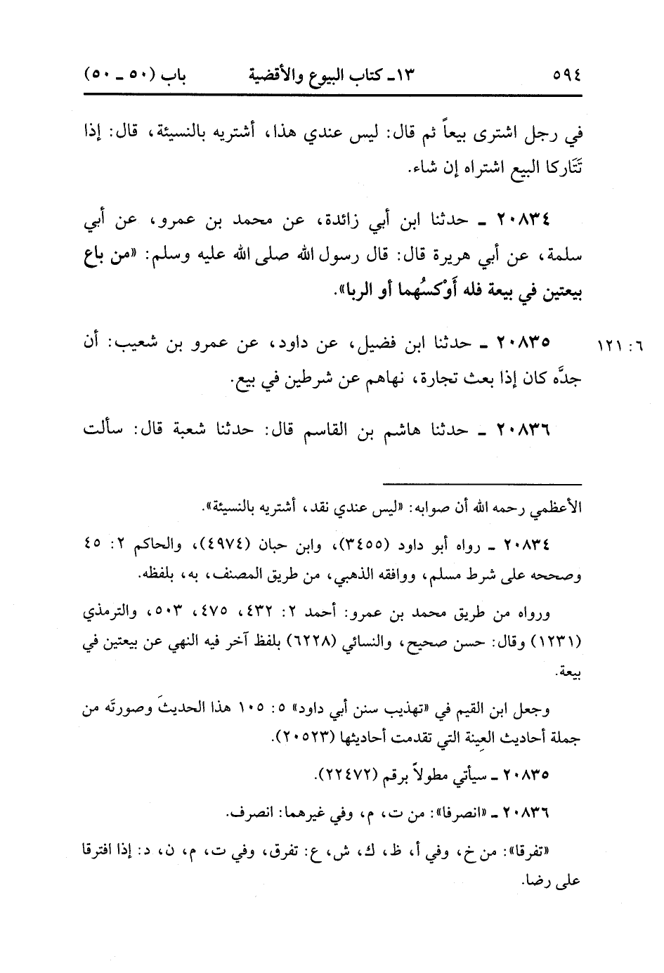 20834- حَدَّثَنَا ابْنُ أَبِي زَائِدَةَ ، عَنْ مُحَمَّدِ بْنِ عَمْرٍو ، عَنْ أَبِي سَلَمَةَ ، عَنْ أَبِي هُرَيْرَةَ ، قَالَ : قَالَ رَسُولُ اللهِ صَلَّى الله عَلَيْهِ وَسَلَّمَ : مَنْ بَاعَ بَيْعَتَيْنِ فِي بَيْعَةٍ فَلَهُ أَوْكَسُهُمَا ، أَوِ الرِّبَا. (6/120).