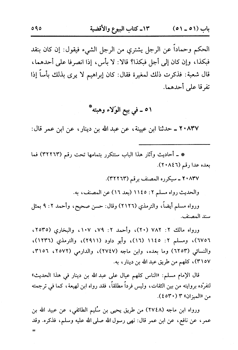 20837- حَدَّثَنَا ابْنُ عُيَيْنَةَ ، عَنْ عَبْدِ اللهِ بْنِ دِينَارٍ ، عَنِ ابْنِ عُمَرَ ، قَالَ : نَهَى رَسُولُ اللهِ صَلَّى الله عَلَيْهِ وَسَلَّمَ عَنْ بَيْعِ الْوَلاَءِ , وَعَنْ هِبَتِهِ. (6/121).