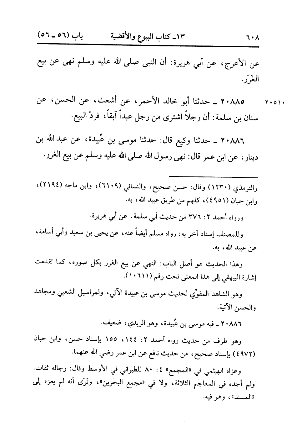 20886- حَدَّثَنَا وَكِيعٌ , قَالَ : حدَّثَنَا مُوسَى بْنُ عُبَيْدَةَ ، عَنْ عَبْدِ اللهِ بْنِ دِينَارٍ ، عَنِ ابْنِ عُمَرَ ، قَالَ : نَهَى رَسُولُ اللهِ صَلَّى الله عَلَيْهِ وَسَلَّمَ , عَنْ بَيْعِ الْغَرَرِ. (6/132).