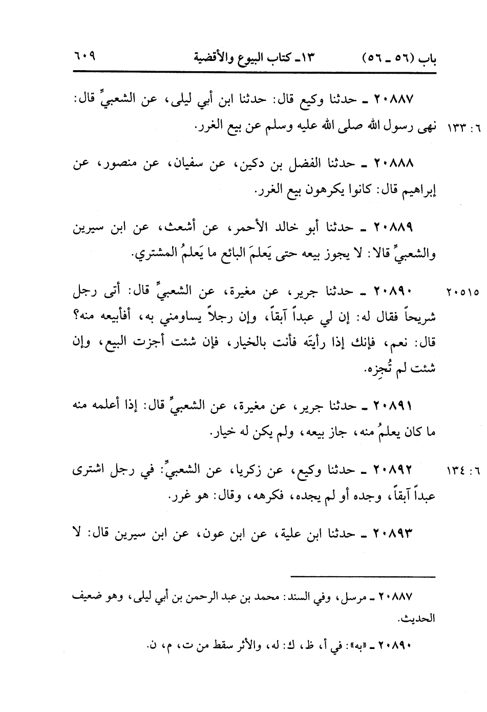 20887- حَدَّثَنَا وَكِيعٌ , قَالَ : حدَّثَنَا ابْنُ أَبِي لَيْلَى ، عَنِ الشَّعْبِيِّ ، قَالَ : نَهَى رَسُولُ اللهِ صَلَّى الله عَلَيْهِ وَسَلَّمَ , عَنْ بَيْعِ الْغَرَرِ. (6/132).