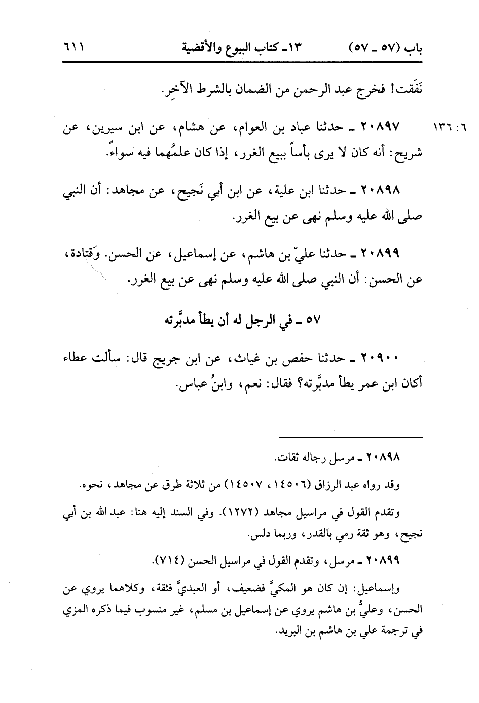 20899- حَدَّثَنَا علي بن هاشم ، عَنْ إسماعيل ، عن الحسن وقتادة ، عن الحسن أن النَّبِيَّ صَلَّى الله عَلَيْهِ وَسَلَّمَ نهى عَنْ بيع الغرر.